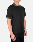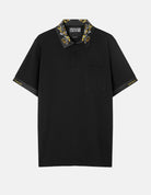 A sleek reinvention of the classic polo, this black Versace Jeans Couture piece combines understated tailoring with bold detailing. Crafted from soft cotton piqué, it features a structured chest pocket and clean lines for a refined finish. The collar is richly embroidered with the house’s signature golden baroque scrolls, creating a striking contrast against the dark base. Discreet logo embroidery on the cuffs completes the design, making this polo a versatile staple that channels both elegance and contemporary edge.