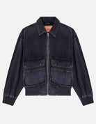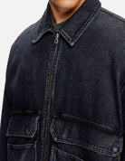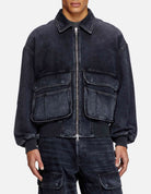 This Diesel denim jacket combines workwear functionality with contemporary edge. Designed in a dark wash, it features a structured zip-up front, oversized flap pockets, and ribbed hem and cuffs for a fitted finish. The pointed collar adds a sharp touch, while subtle fading enhances its lived-in character. A bold, utilitarian piece that channels Diesel’s signature urban-cool aesthetic.