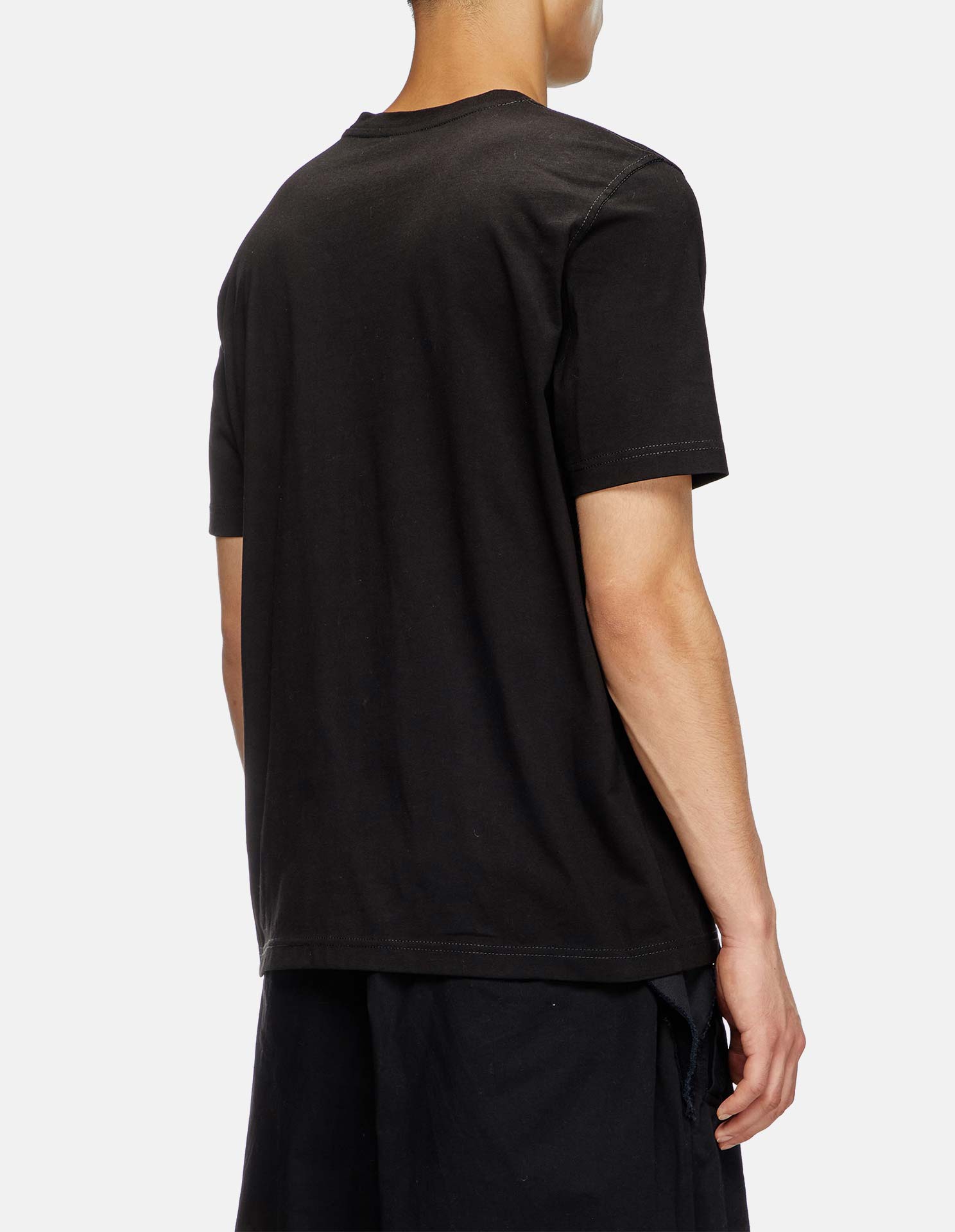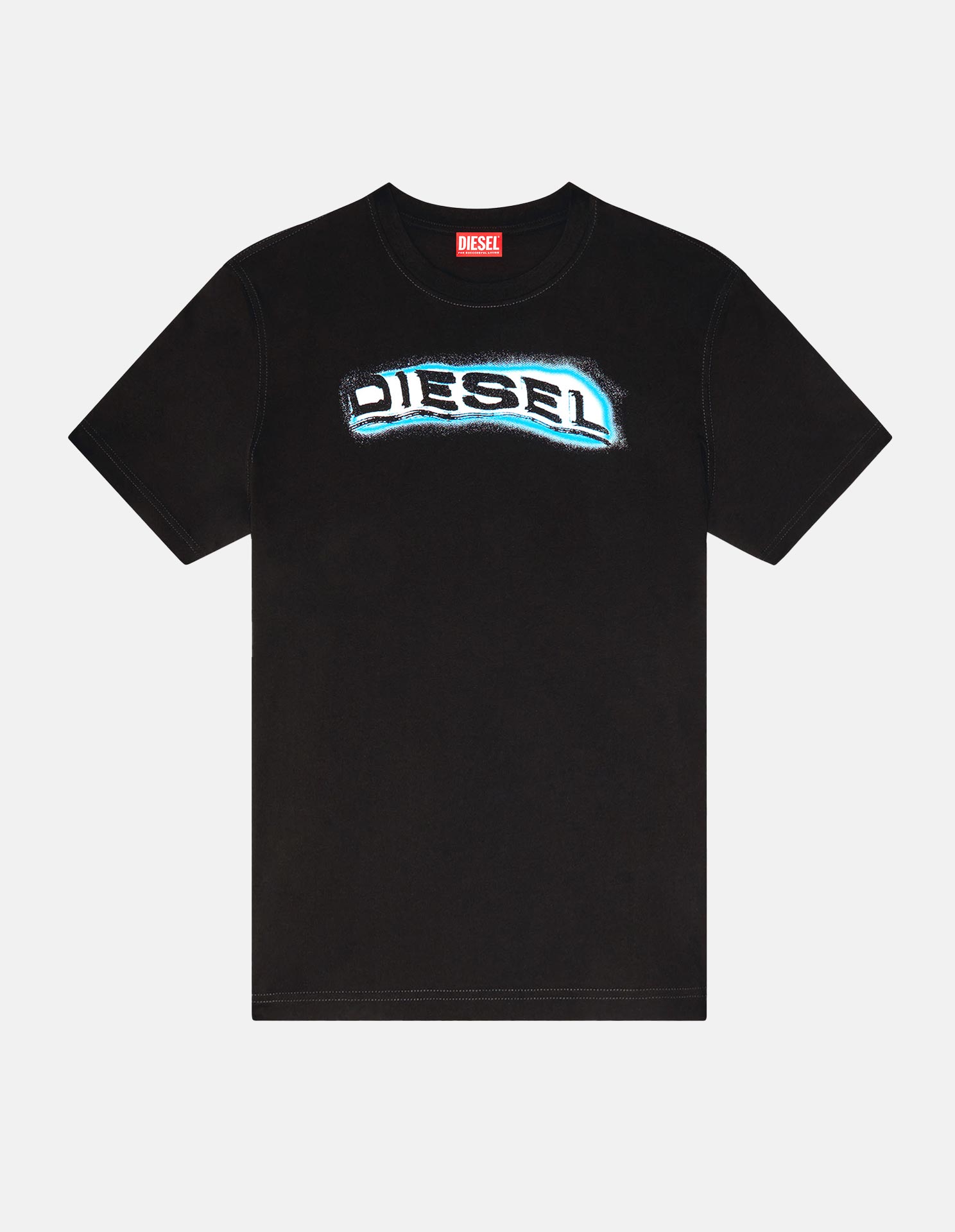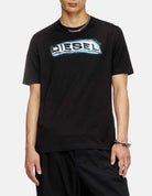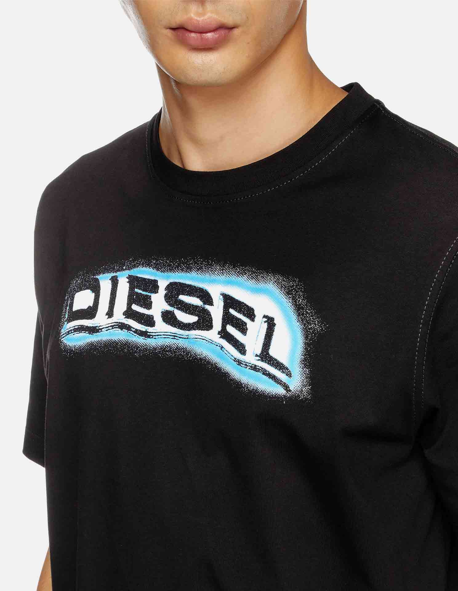 This Diesel graphic T-shirt delivers a bold, street-ready edge. Crafted in black cotton, it’s defined by a distorted Diesel logo across the chest, outlined in electric blue for a striking neon effect. With its crew neckline and regular fit, this piece fuses everyday comfort with the brand’s rebellious, urban aesthetic.