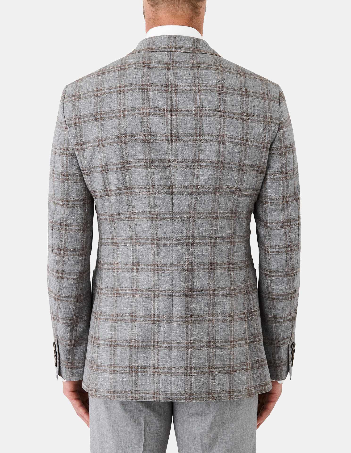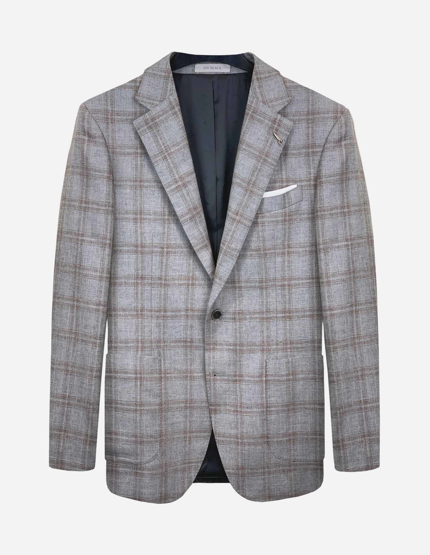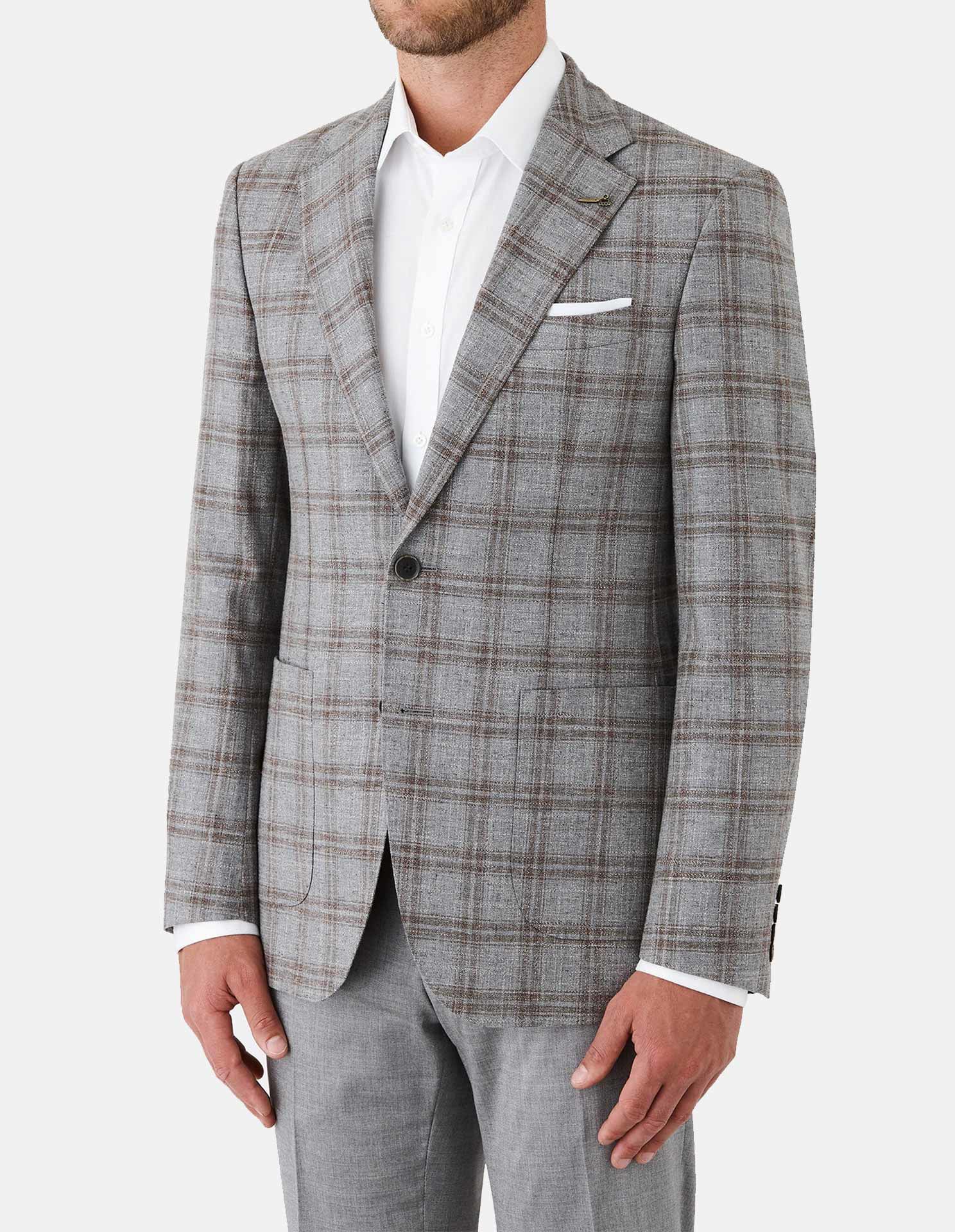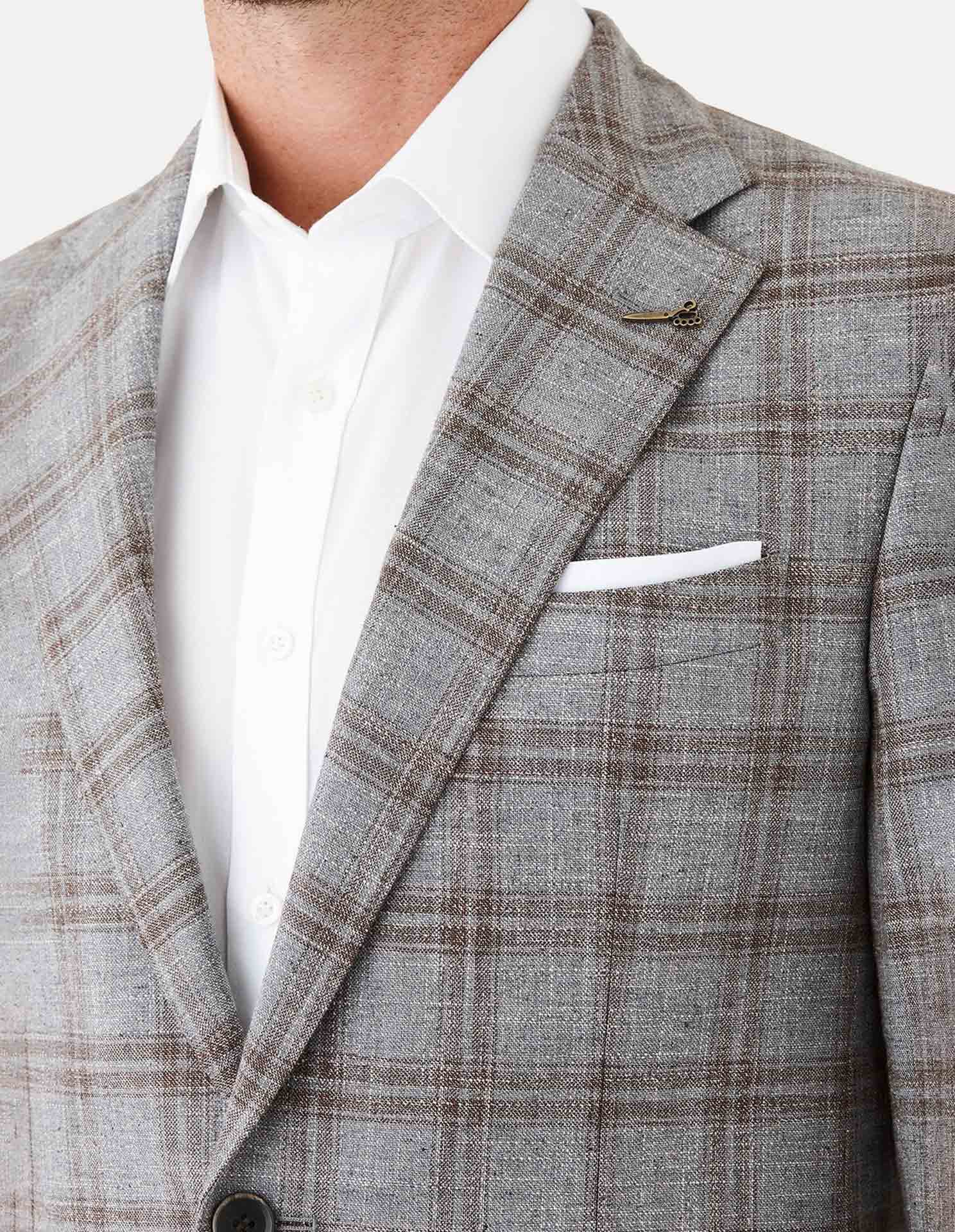Crafted from Marlane, a prestigious Italian mill, this tailored-fit Black Guard jacket showcases a tonal grey textured slub fabric with a large chocolate check for a sophisticated and comfortable look