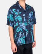 A striking take on the Versace Barocco style, featuring giant acanthus leaves, outlined by gestural navy ink strokes. This regular fit viscose shirt is the perfect summer piece to stay cool, whilst keeping the Versace flair.