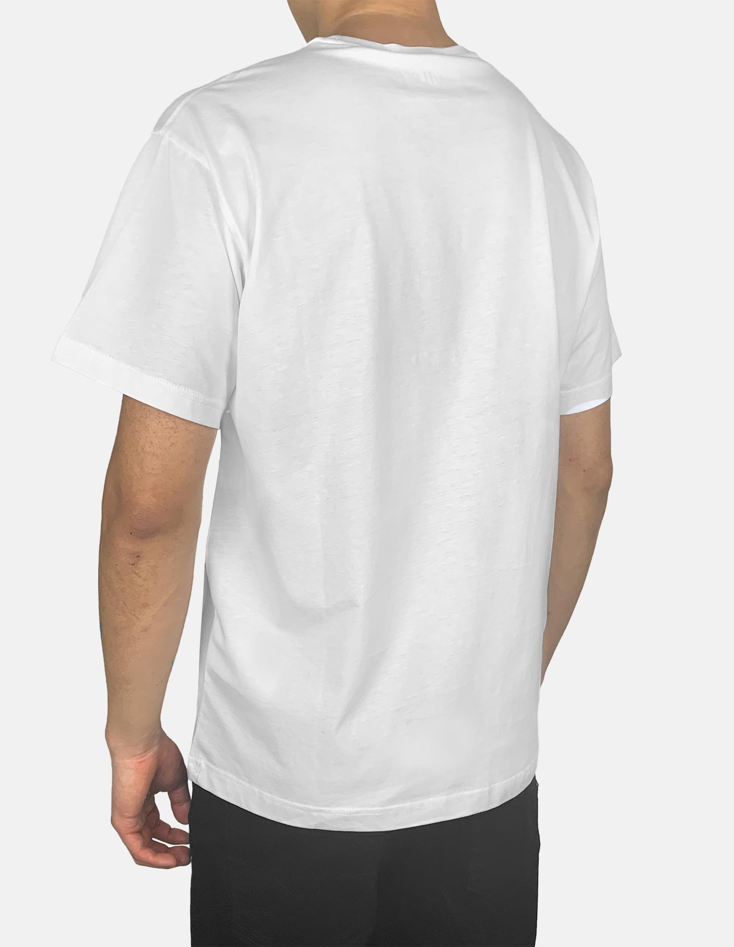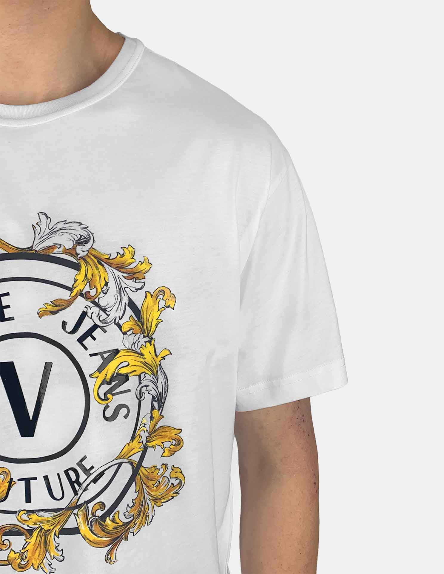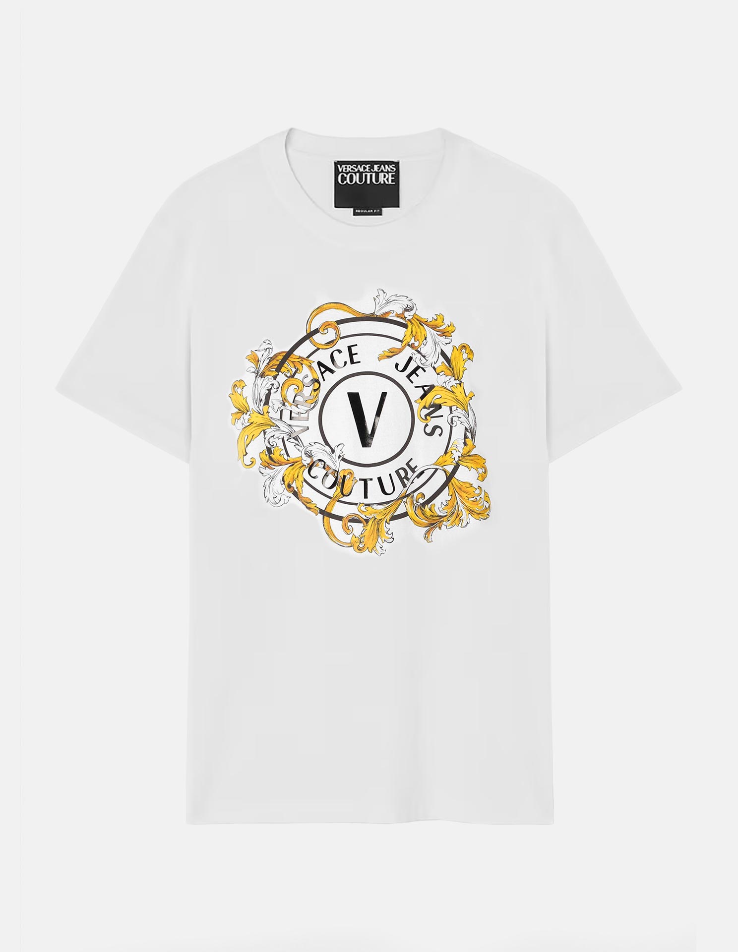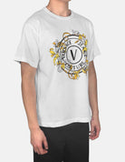 Elevating a wardrobe essential into a statement piece, this white cotton T-shirt is adorned with the unmistakable Versace Jeans Couture emblem. At its heart lies the bold circular V-logo, framed by swirling baroque flourishes in rich gold and black. The ornate detailing contrasts against the clean backdrop, creating a sense of modern opulence.
