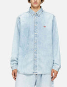 This Diesel denim shirt brings a modern twist to a timeless staple. Cut from light-wash cotton denim, it features a structured button-up front, pointed collar, and subtle fading for a lived-in feel. A small embroidered Diesel logo at the chest adds a punch of brand identity, while the clean silhouette makes it versatile for layering or wearing solo. Rugged yet refined, it’s a core piece that captures Diesel’s urban-cool DNA.