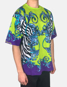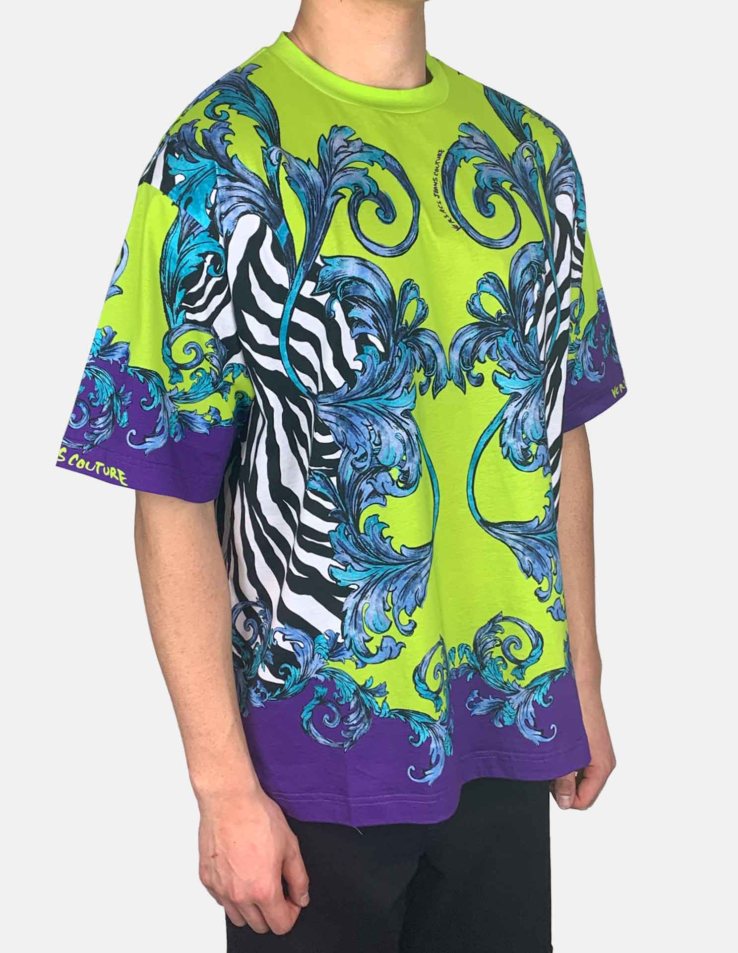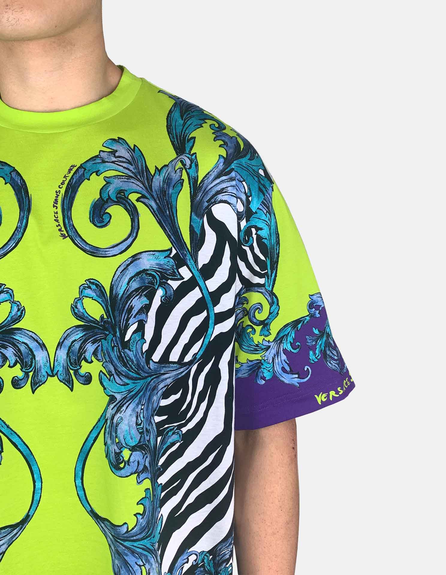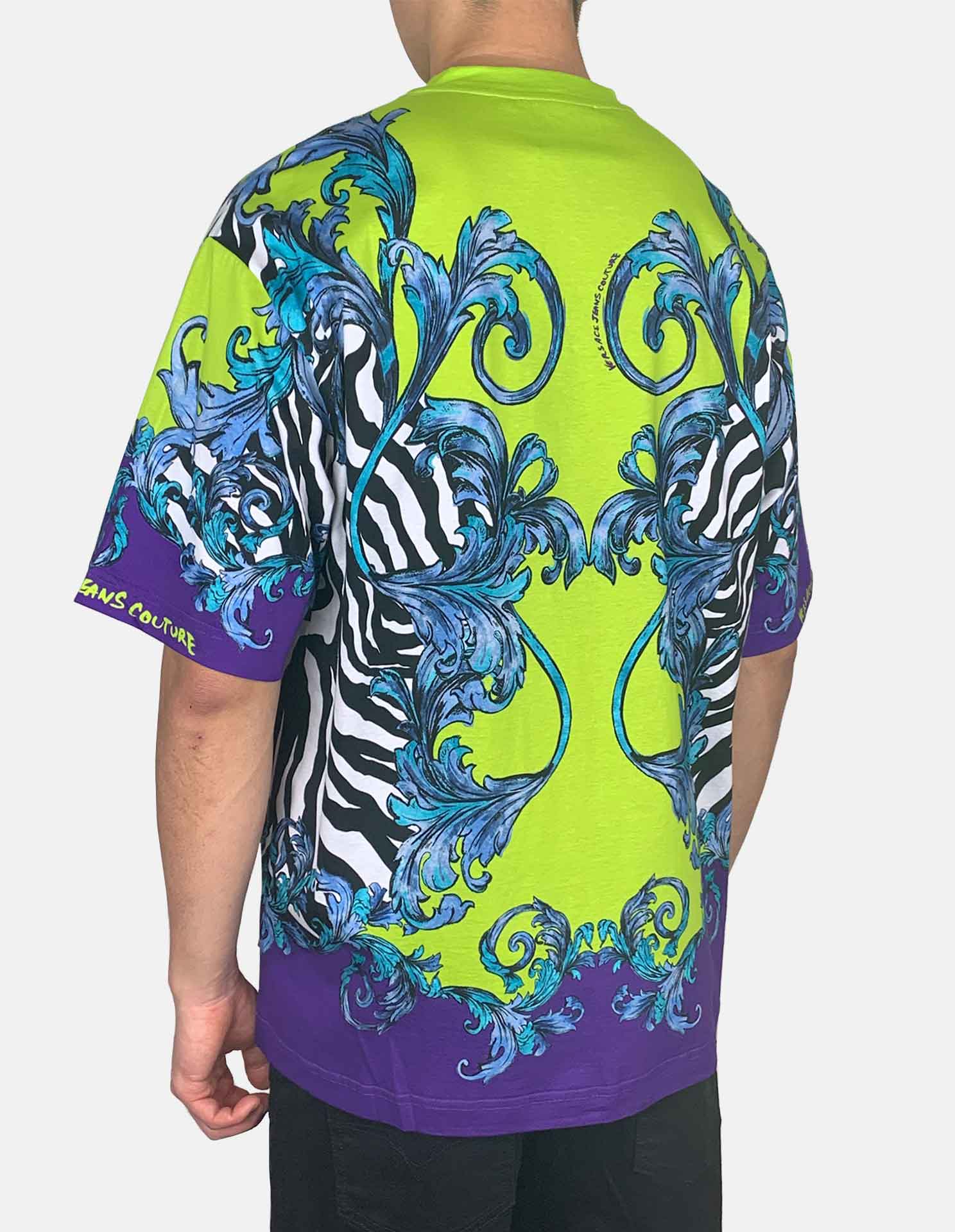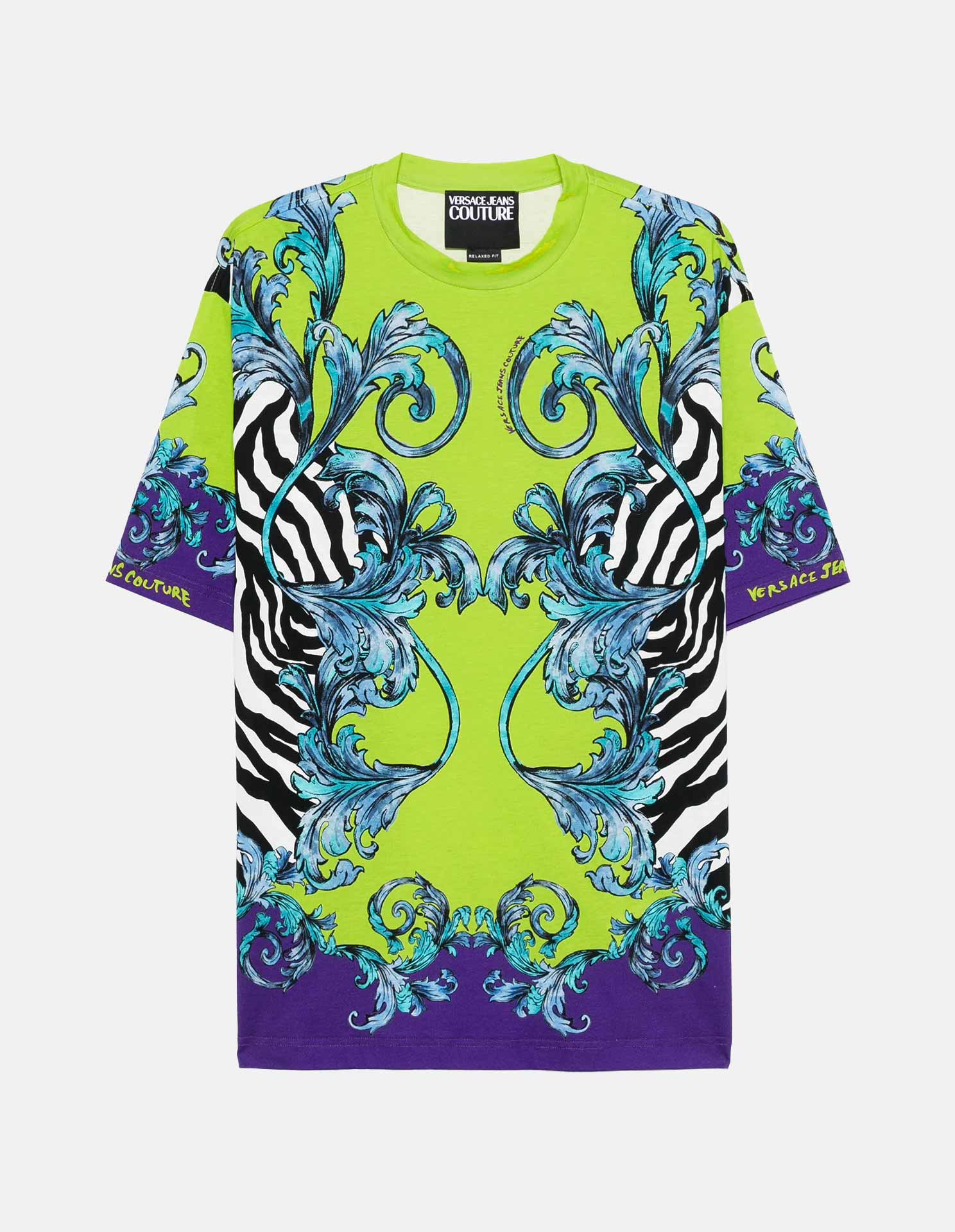 This Versace Jeans Couture T-shirt is a bold clash of color and print, embodying the brand’s unapologetic maximalism. The vibrant lime-yellow base is framed by royal purple accents, while swirling turquoise baroque motifs intertwine with zebra stripes for a striking contrast. Cut in a relaxed fit with a crew neckline, it’s a fearless statement piece that channels pure Versace energy.