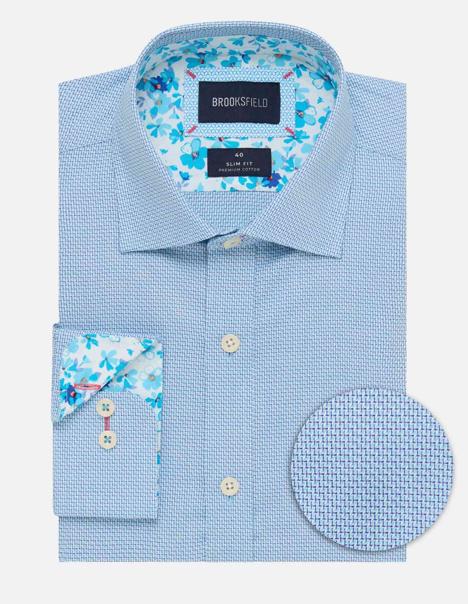 This Brooksfield slim-fit shirt is made from premium cotton and showcases a subtle blue micro-pattern that gives it a clean, modern texture. The inside collar and cuffs reveal a bright floral print in shades of aqua and turquoise, adding a refreshing contrast that stays true to Brooksfield’s refined yet playful detailing. Finished with light buttons and precise tailoring, it’s a versatile piece that moves easily between office wear and polished weekend outfits.