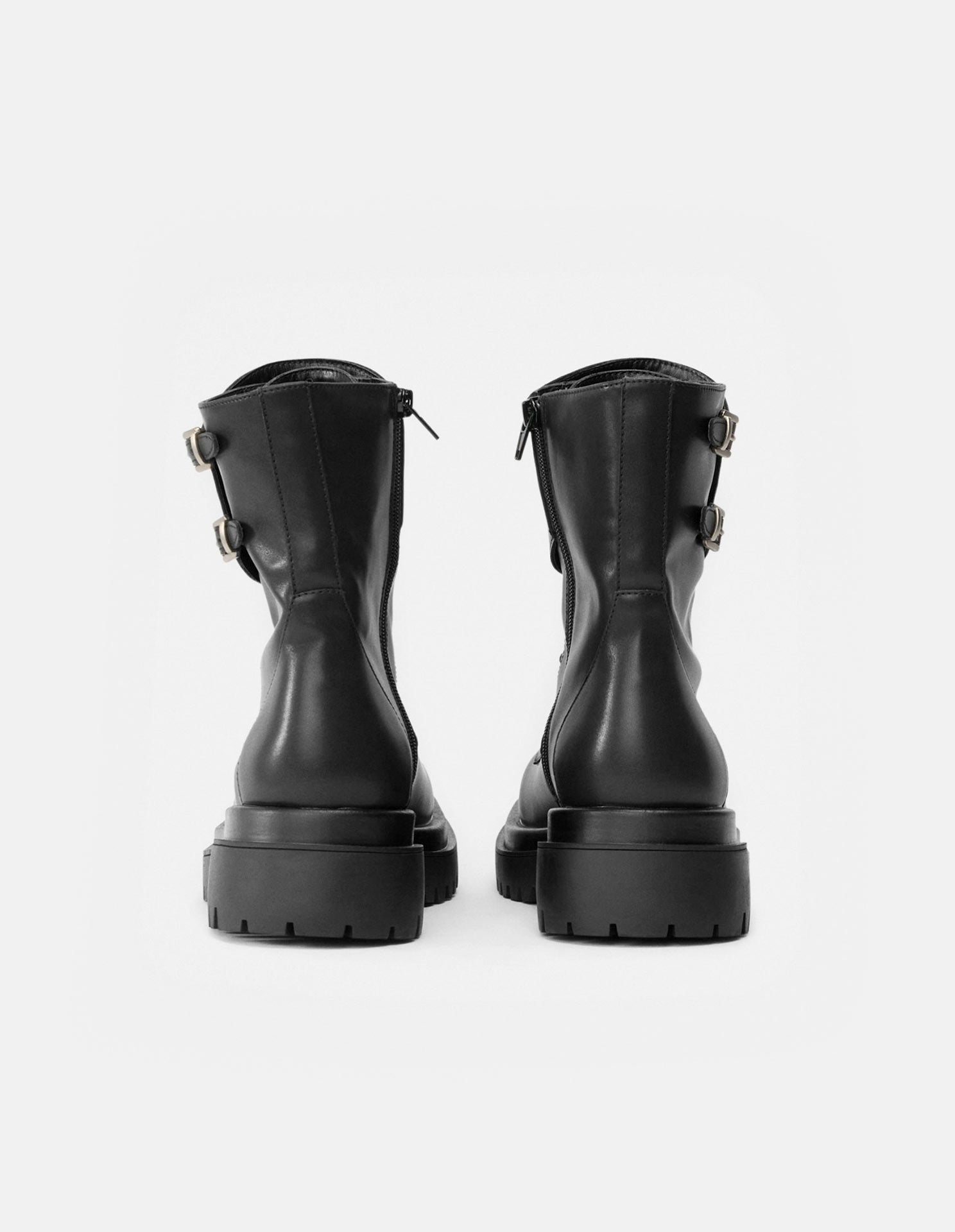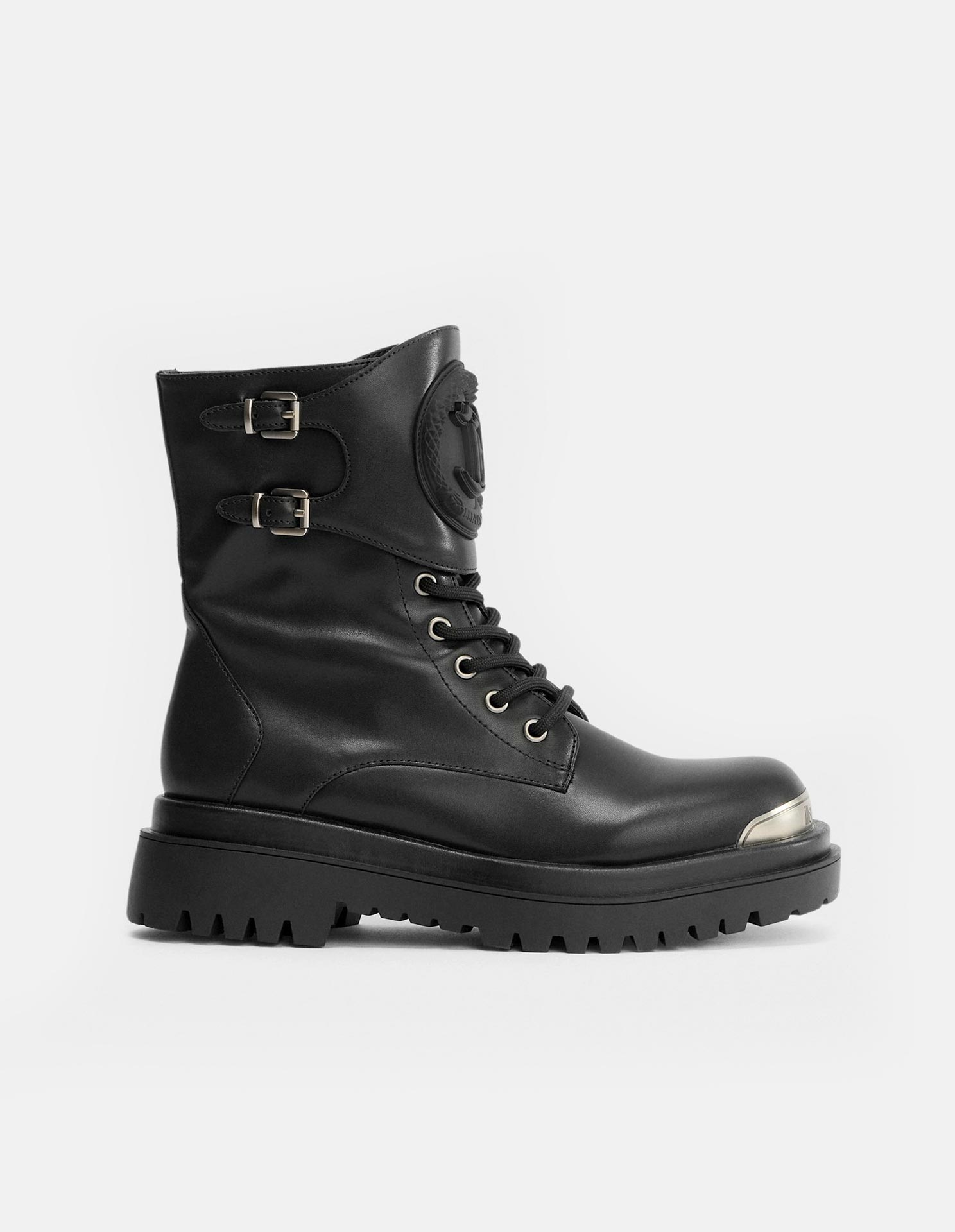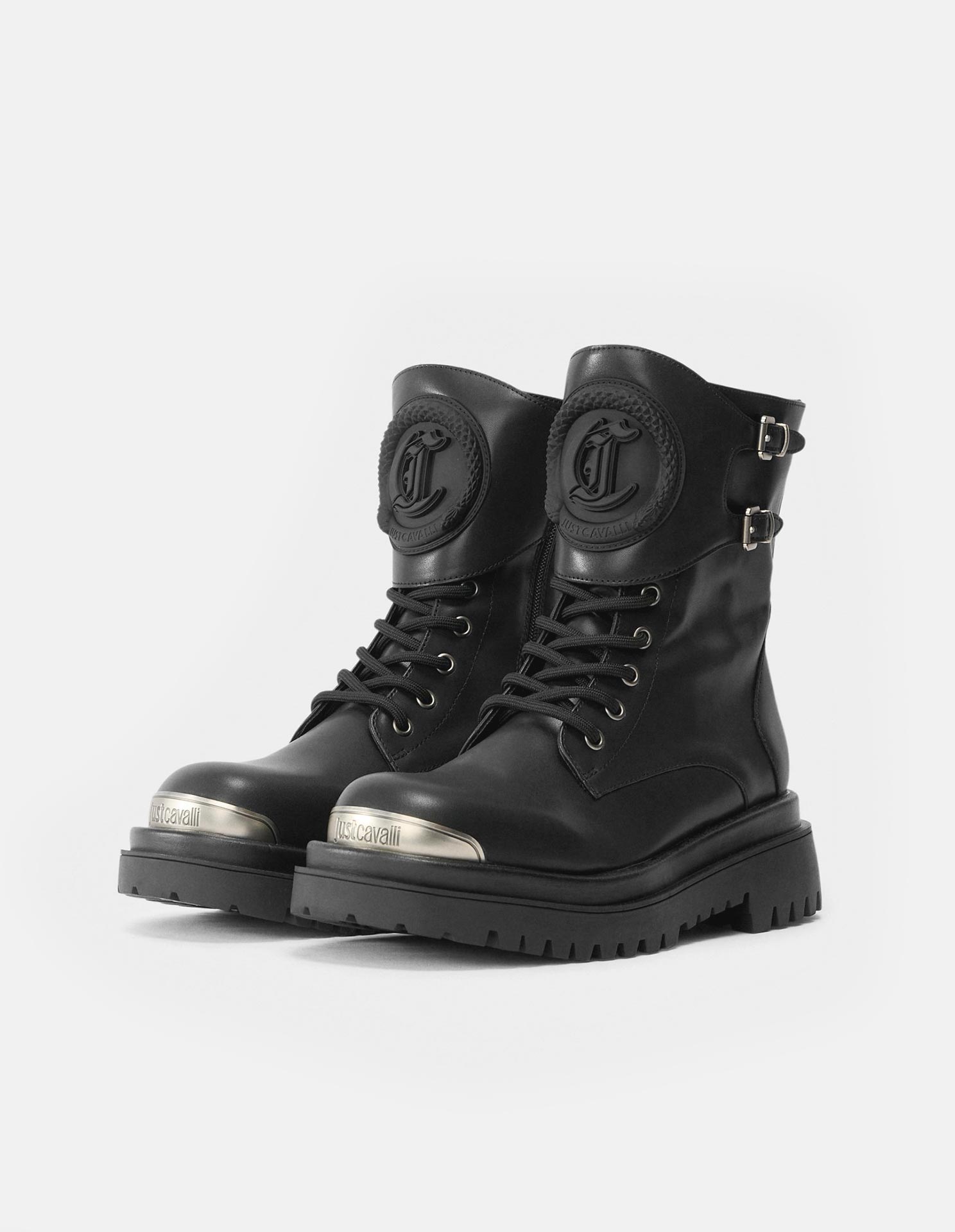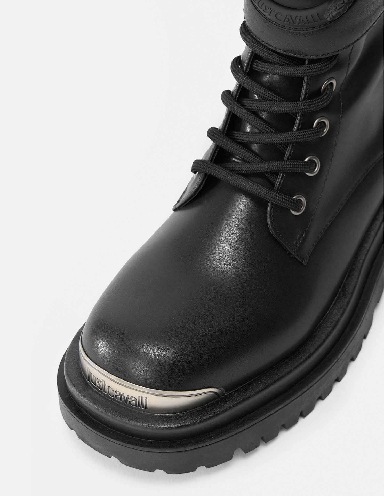 Make a bold statement in these black leather combat boots, elevated with a sculpted crest detail and polished metal toe cap for unmistakable attitude. The structured lace-up front and rugged lug sole channel fearless energy, while refined finishes deliver signature Just Cavalli edge. Designed for those who walk with power and unapologetic style.