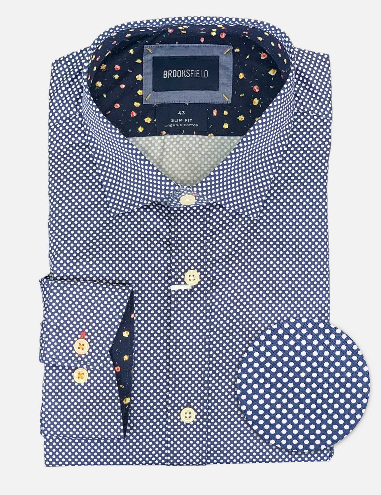 Brooksfield delivers the Slim Fit range that offers a smart, lustrous slimming look. This navy shirt is textured with polka-dot motifs that is spun & crafted with premium high-twist yarns made from sustainable cotton.