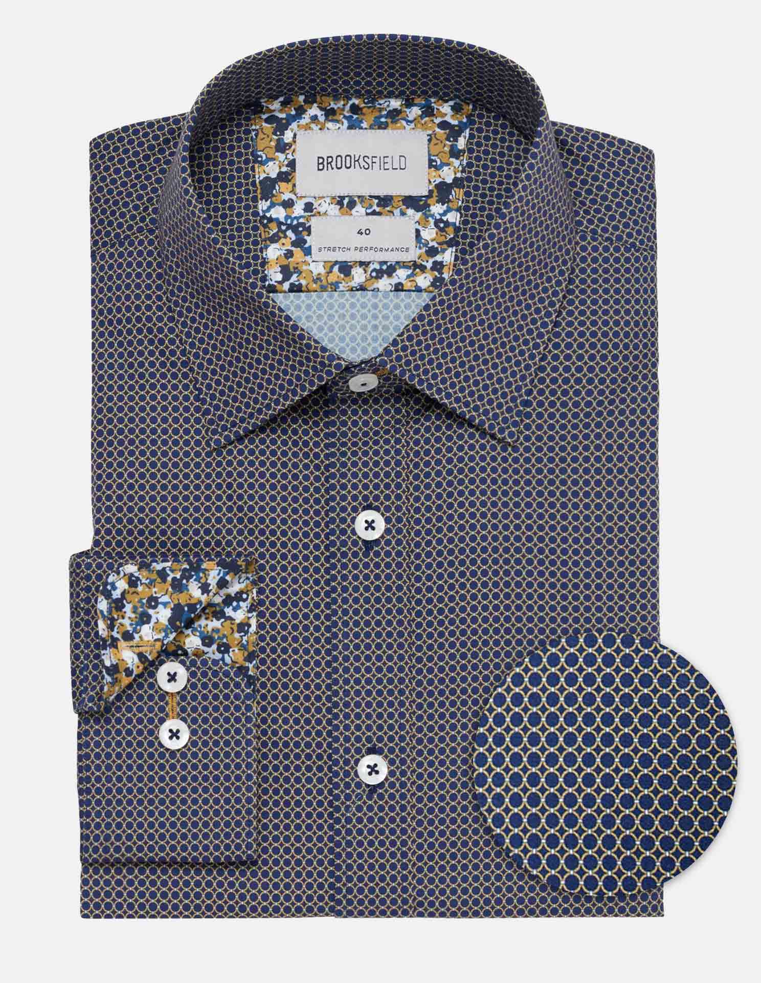 Brooksfield Stretch Performance Regular Fit Shirt, a stylish choice for both work or a special occasion with navy gold ring print. Crafted from a premium blend of 97% cotton and 3% spandex, this shirt offers exceptional comfort, durability, and a stretch for ease of movement.