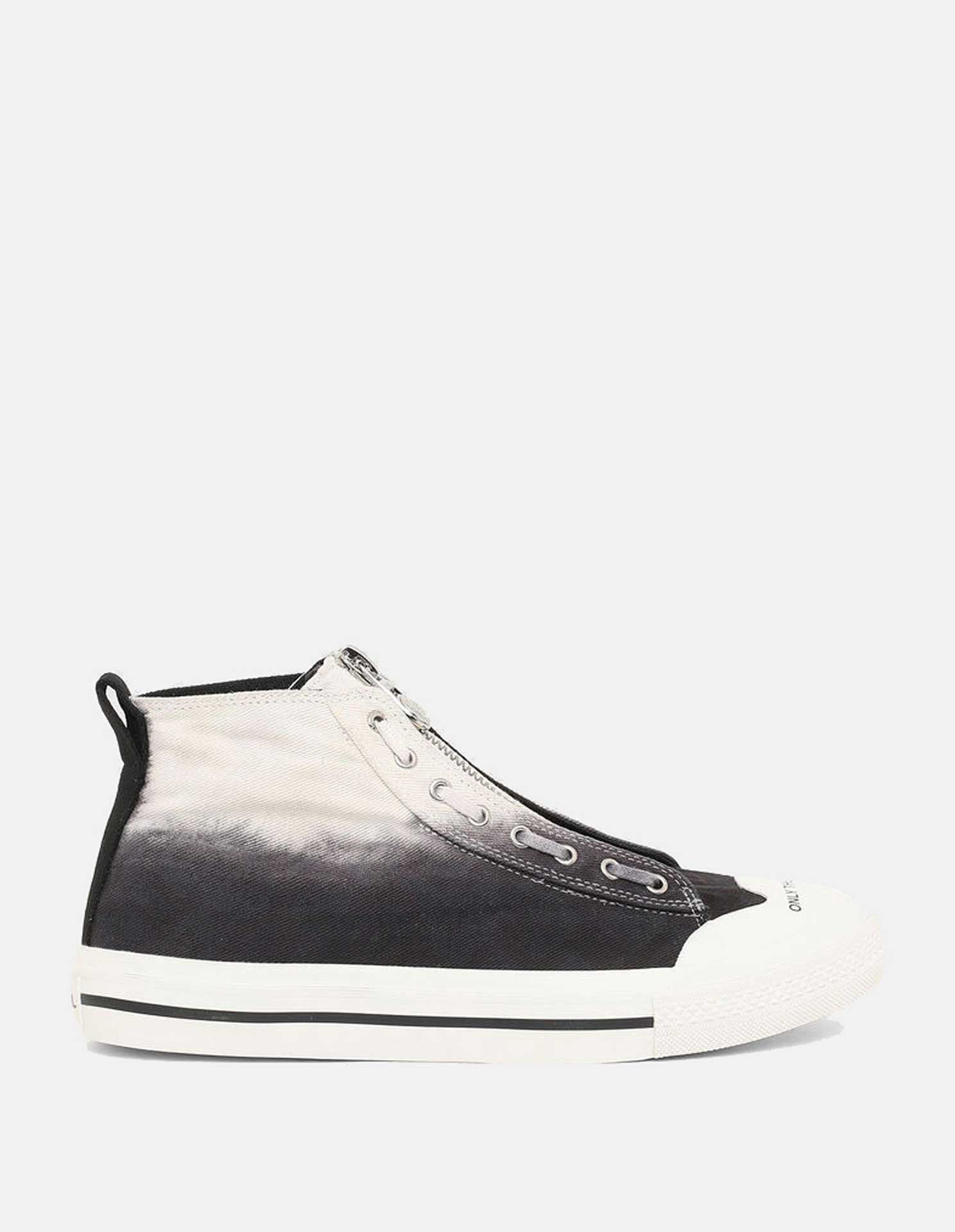 High-top canvas sneakers in washed Diesel logo grey. Round tonal rubber cap toe. Mid Zip-up closure. Rubberized logo appliqué at tongue. Webbing pull-loop in blue at heel collar. Eyelet vents at inner side. Webbing trim in black at heel. Tonal textured rubber midsole featuring black stripe, printed logo at the outer side, and logo patch at heel. Tonal textured rubber outsole.