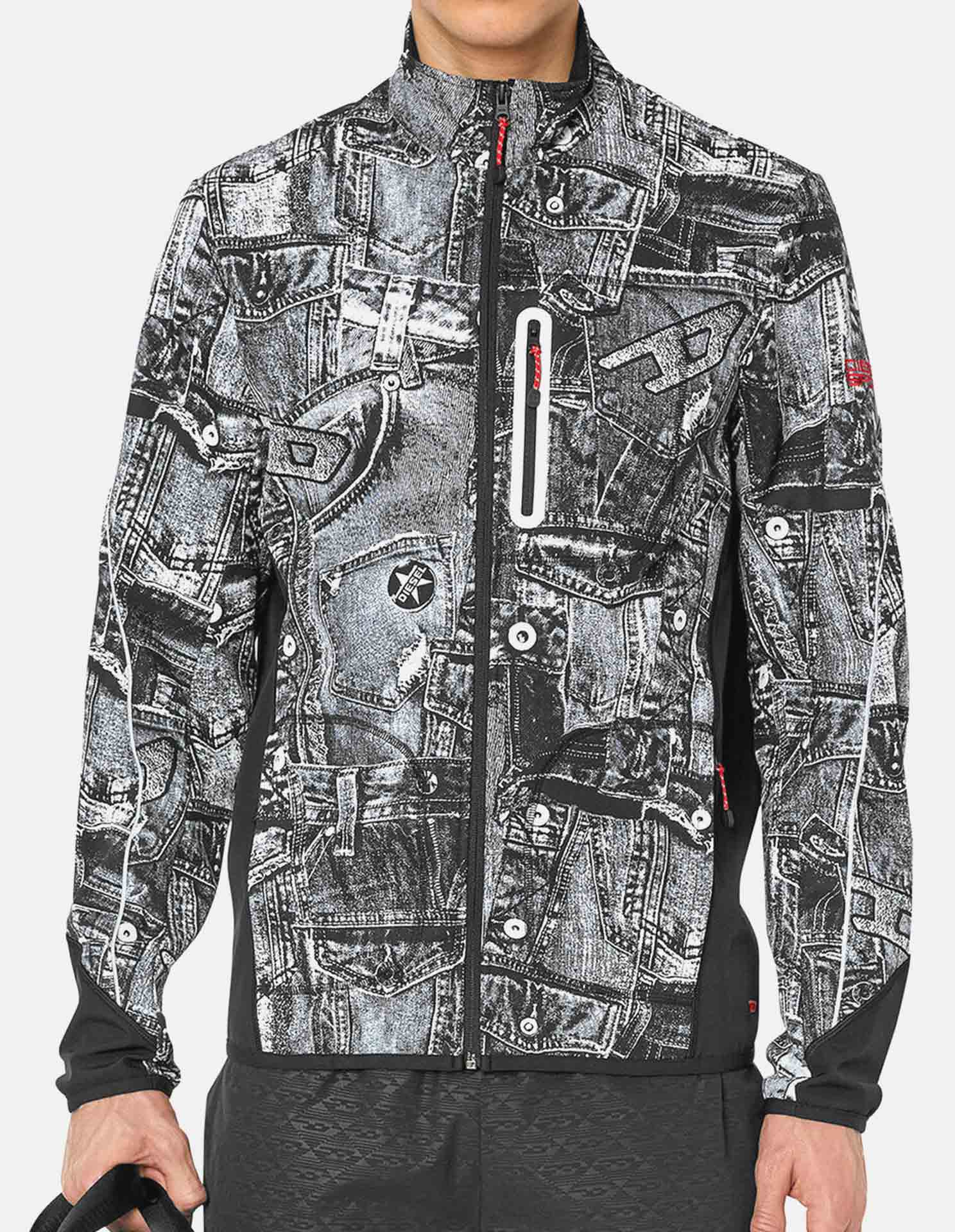 This track jacket combines functionality and style. Designed from Diesel technical fabric to help regulate body heat for optimal performance. This track jacket features an all over graphic of various denim pieces, an acknowledgement to the brands heritage. This jacket is complimented with side zip and chest pockets.