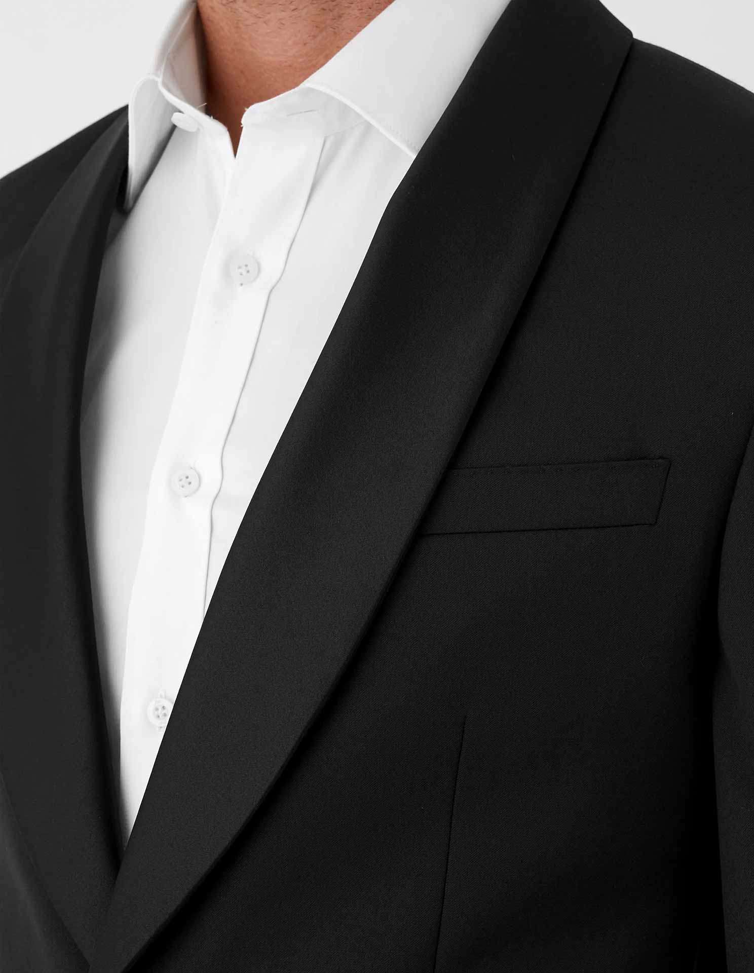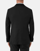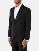 This black formal tailored suit brings a refined, formal look with its smooth satin shawl lapel and single-button closure. Cut in a modern slim profile, it features jetted pockets, a chest welt, and a sleek, fully lined interior for comfortable wear. A polished option for black-tie events, it pairs effortlessly with dress trousers and a crisp white shirt for a timeless evening ensemble.