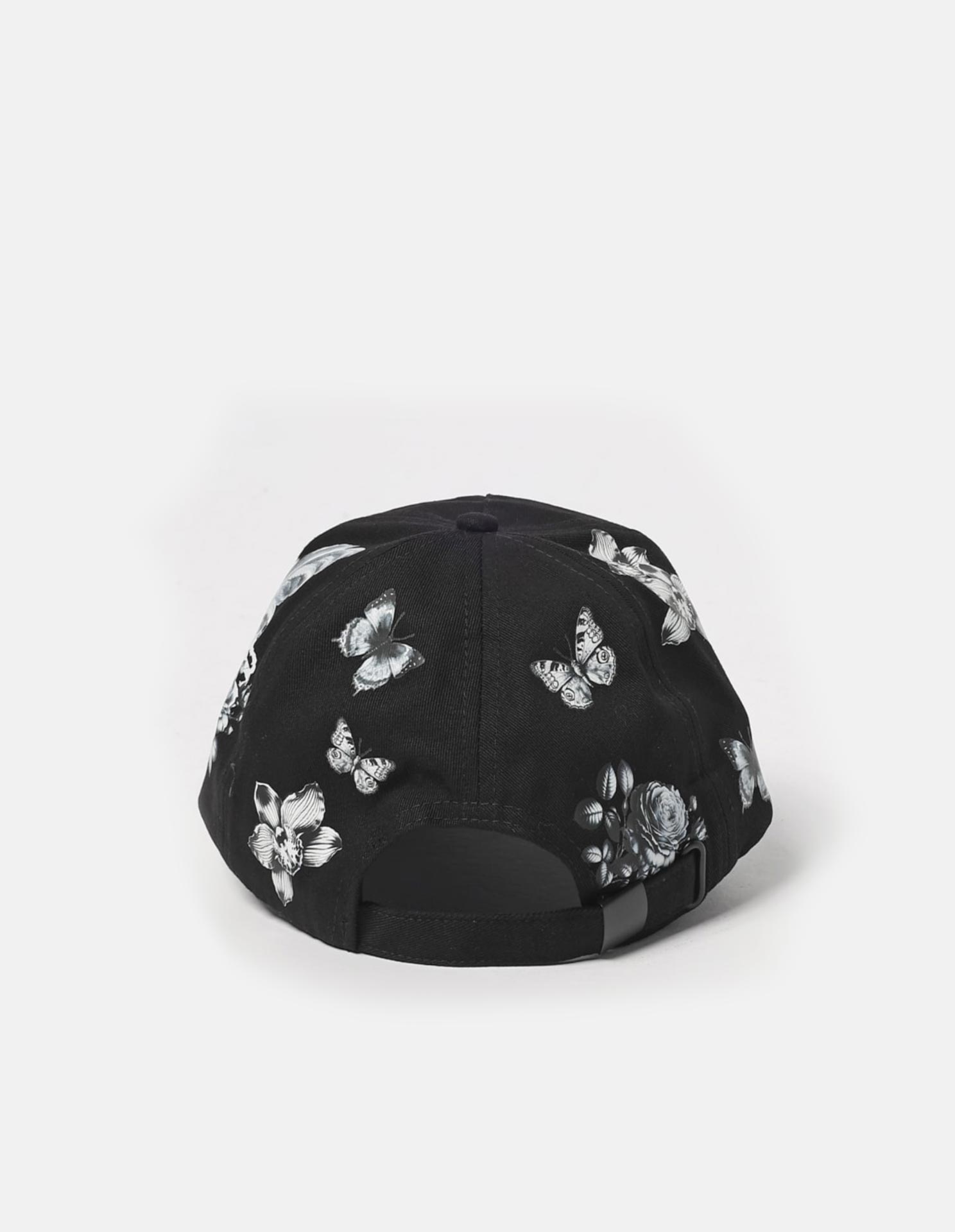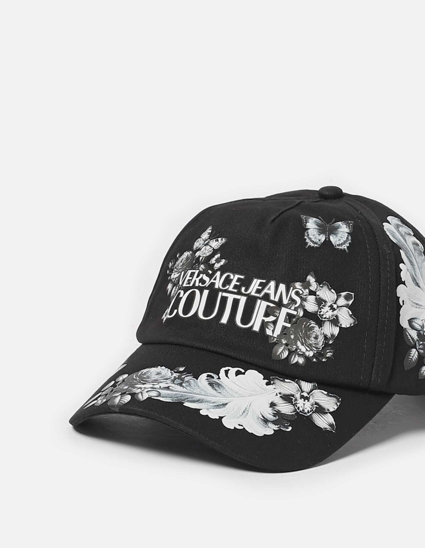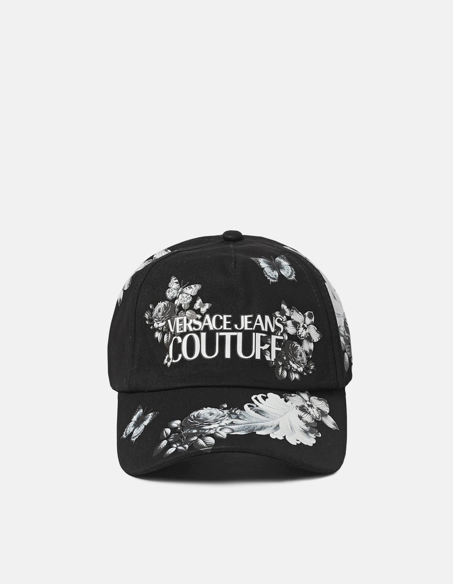 A sleek black cotton baseball cap featuring a striking butterfly and floral motif across the crown. Made from soft, breathable cotton, it delivers all-day comfort with a bold visual edge. The underside of the brim is detailed with an embroidered “Versace Jeans Couture” logo for a refined signature finish. A statement accessory that adds a confident, VJC-inspired touch to casual styling.
