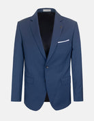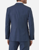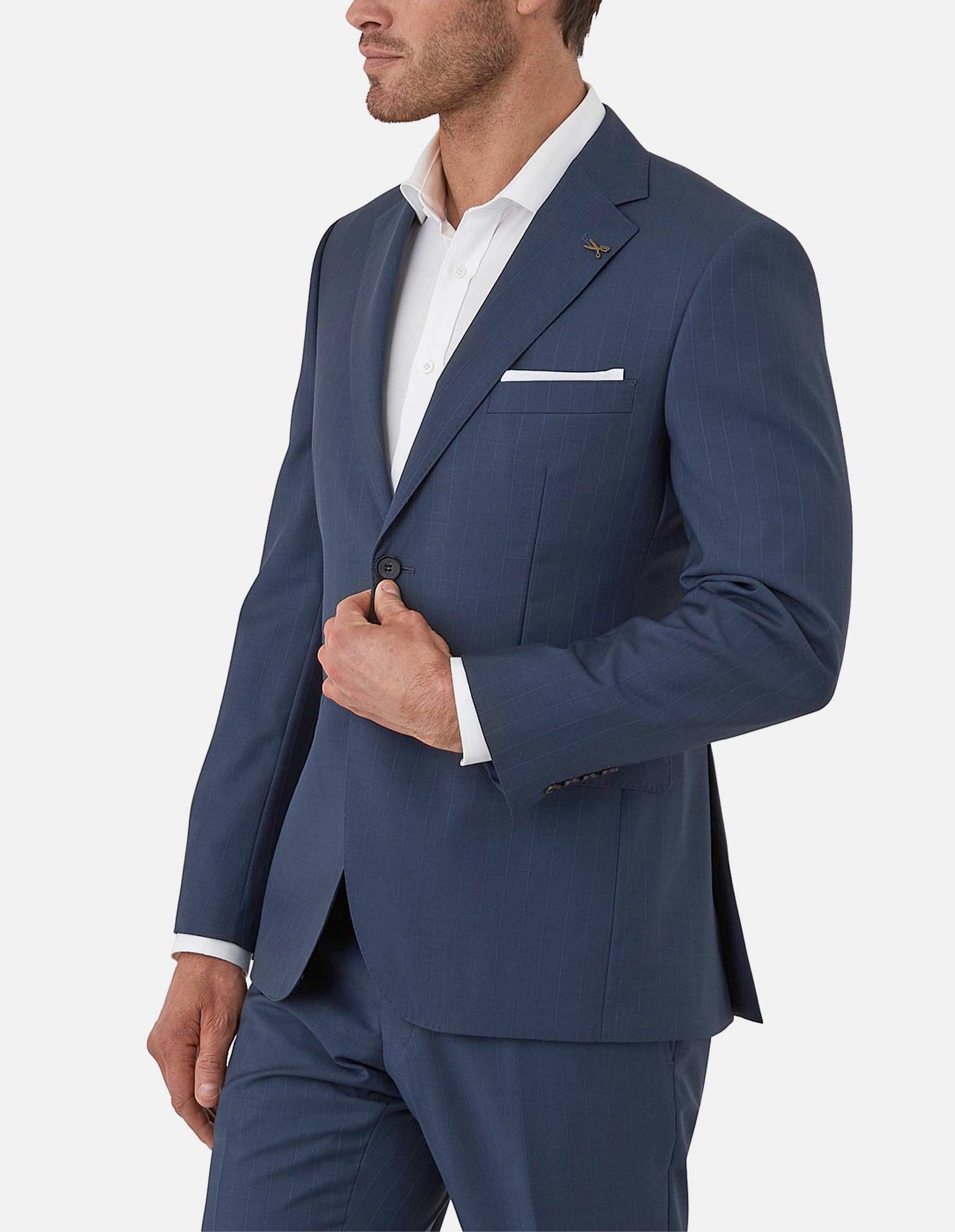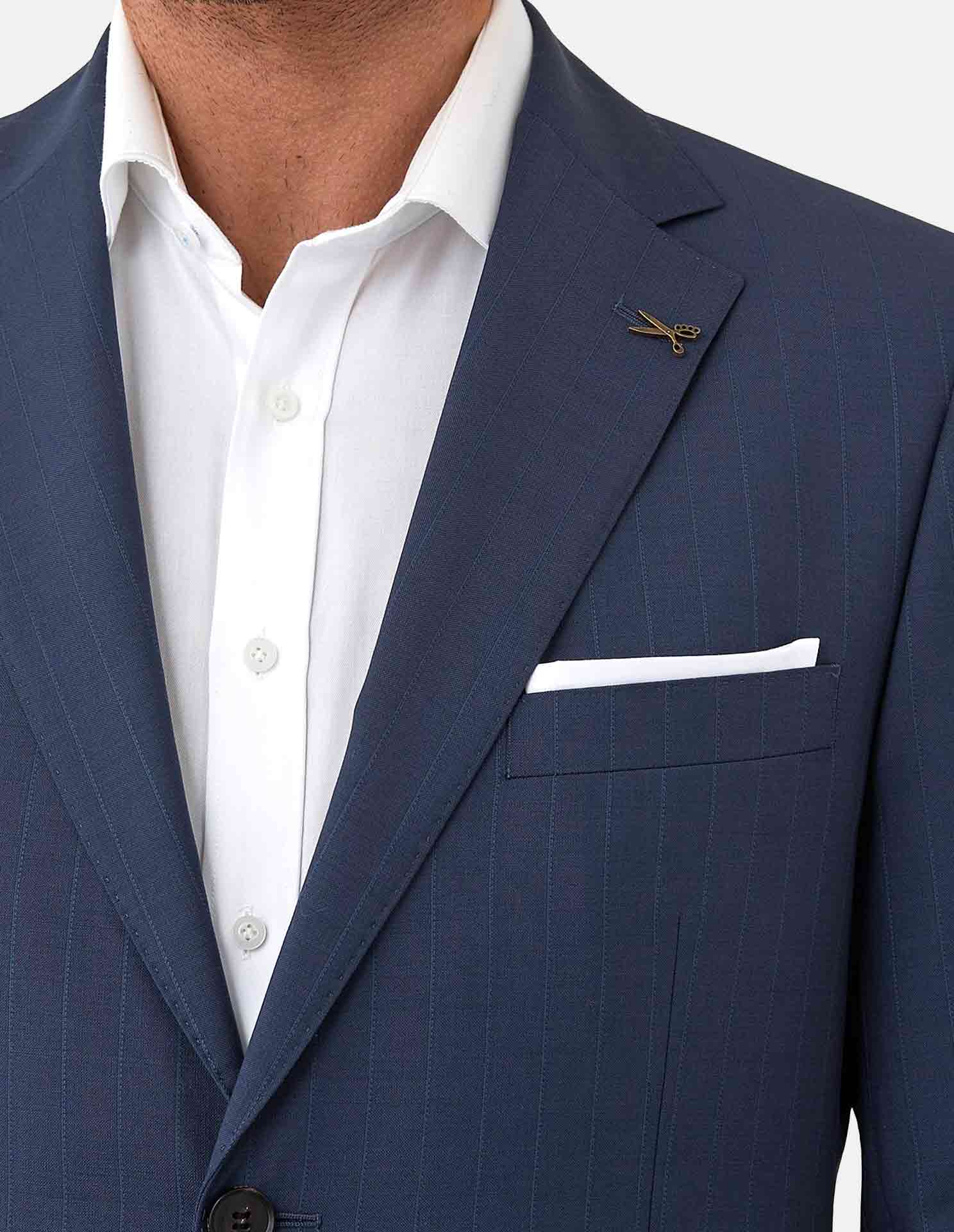 A versatile all-season tailored-fit suit in a navy base with subtle striped. Crafted with a half-canvas front, it features a notch lapel, two-button closure, flap pockets, and side vents for a timeless, refined look.