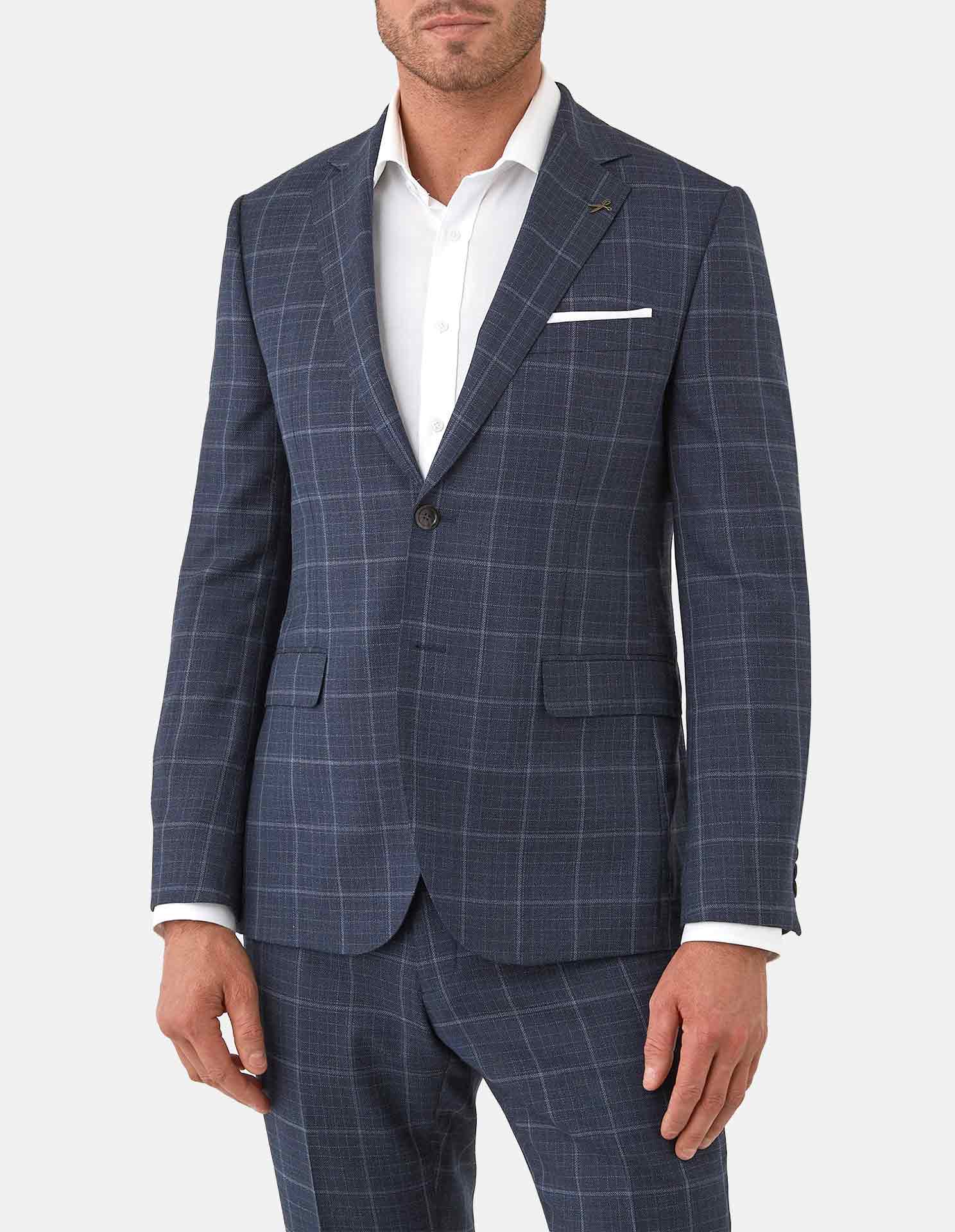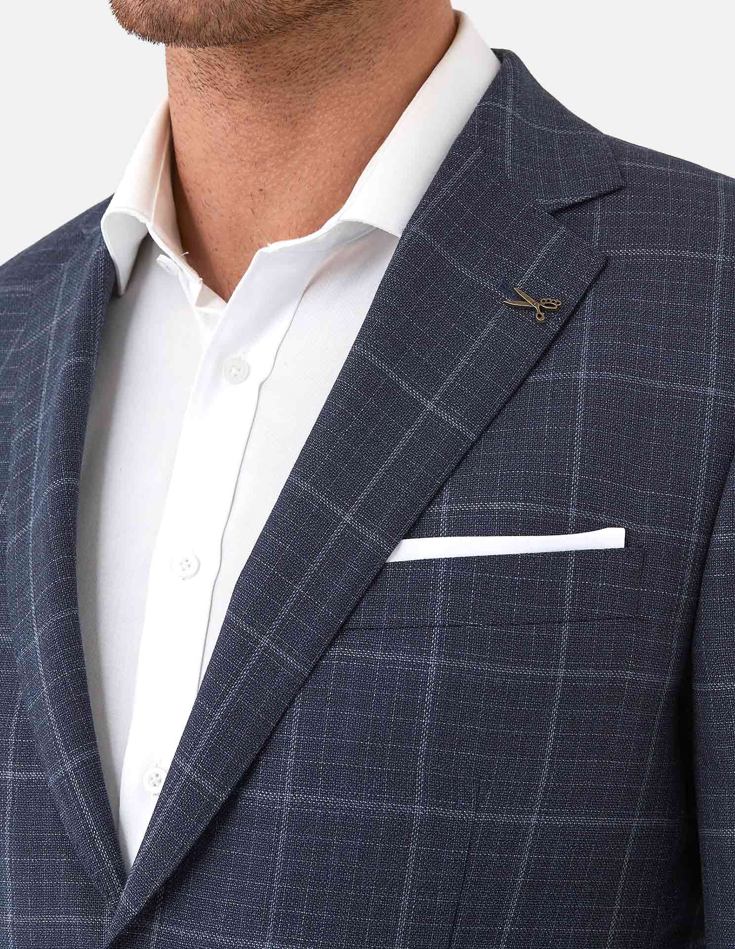 A refined take on modern tailoring, this navy check suit is designed for effortless sophistication. Cut in a clean, contemporary silhouette, the jacket features a subtle windowpane check that adds depth without overpowering, making it ideal for both business and elevated occasions.