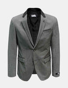 Expertly handcrafted, this Grey two-button stretch suit is constructed with perfection. Wear them as a jacket or a suit. As a classical piece with avant-garde style, this lightweight suit features contrast black notch lapels with Karl logo detailing, 2 button fastening, and sleeves, flapped welt pockets, a double vent to the rear. Completed with the Lagerfeld superior quality lining. Paired with dress pants that can also be worn as separates