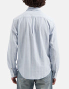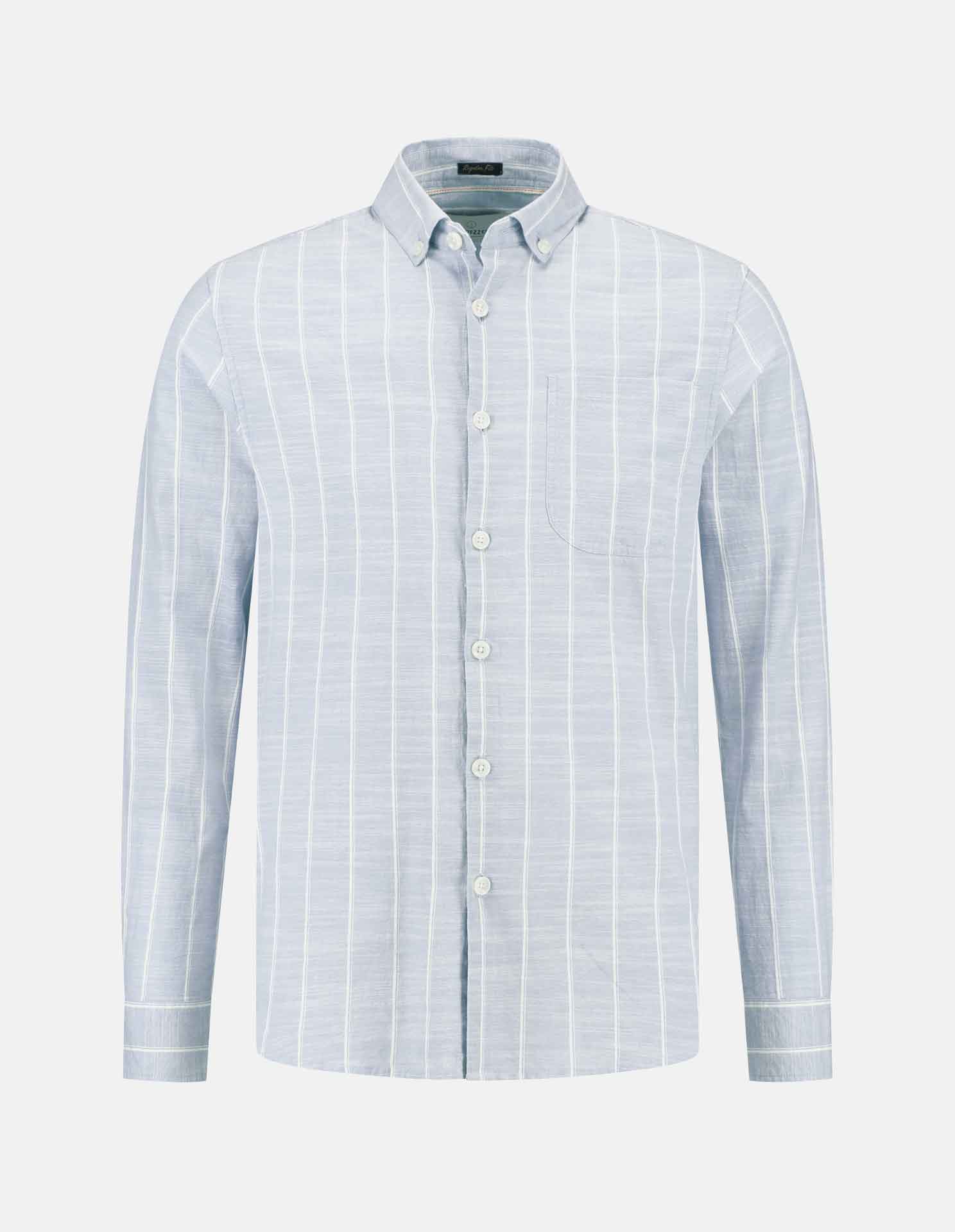 A fresh essential for smart-casual days, the DSTREZZED Linen Blend Stripe Shirt in sky blue captures relaxed sophistication. Crafted from breathable lightweight cotton, it features clean vertical white stripes, a chest pocket, and button-down collar — perfect for layering or wearing solo with rolled sleeves.