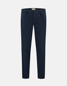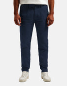 Tailored for comfort with a refined edge, these DSTREZZED trousers feature a subtle textured weave that adds depth to their clean navy profile. The lightweight stretch fabric offers effortless movement, while the elastic waistband and slim silhouette strike the perfect balance between smart and casual. Ideal for both relaxed office days and polished weekend looks.