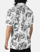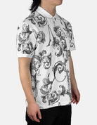 A bold reinterpretation of classic sportswear, this polo showcases Versace Jeans Couture’s signature baroque artistry in an all-over monochrome print. Set against a crisp white base, the swirling acanthus leaves create a striking visual rhythm, blending old-world opulence with modern ease. The structured polo collar and button placket balance refinement with versatility, while subtle logo detailing is woven seamlessly into the design. A statement piece that turns everyday wear into an expression of Italian luxury.