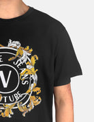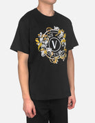 This Versace Jeans Couture T-shirt embodies the brand’s iconic baroque spirit with a modern streetwear edge. Crafted from soft black cotton, it features a bold central crest framed by ornate golden and white acanthus motifs, highlighting Versace’s unmistakable aesthetic. With its classic crew neck and sharp graphic detailing, this tee delivers everyday luxury with unmistakable couture flair.