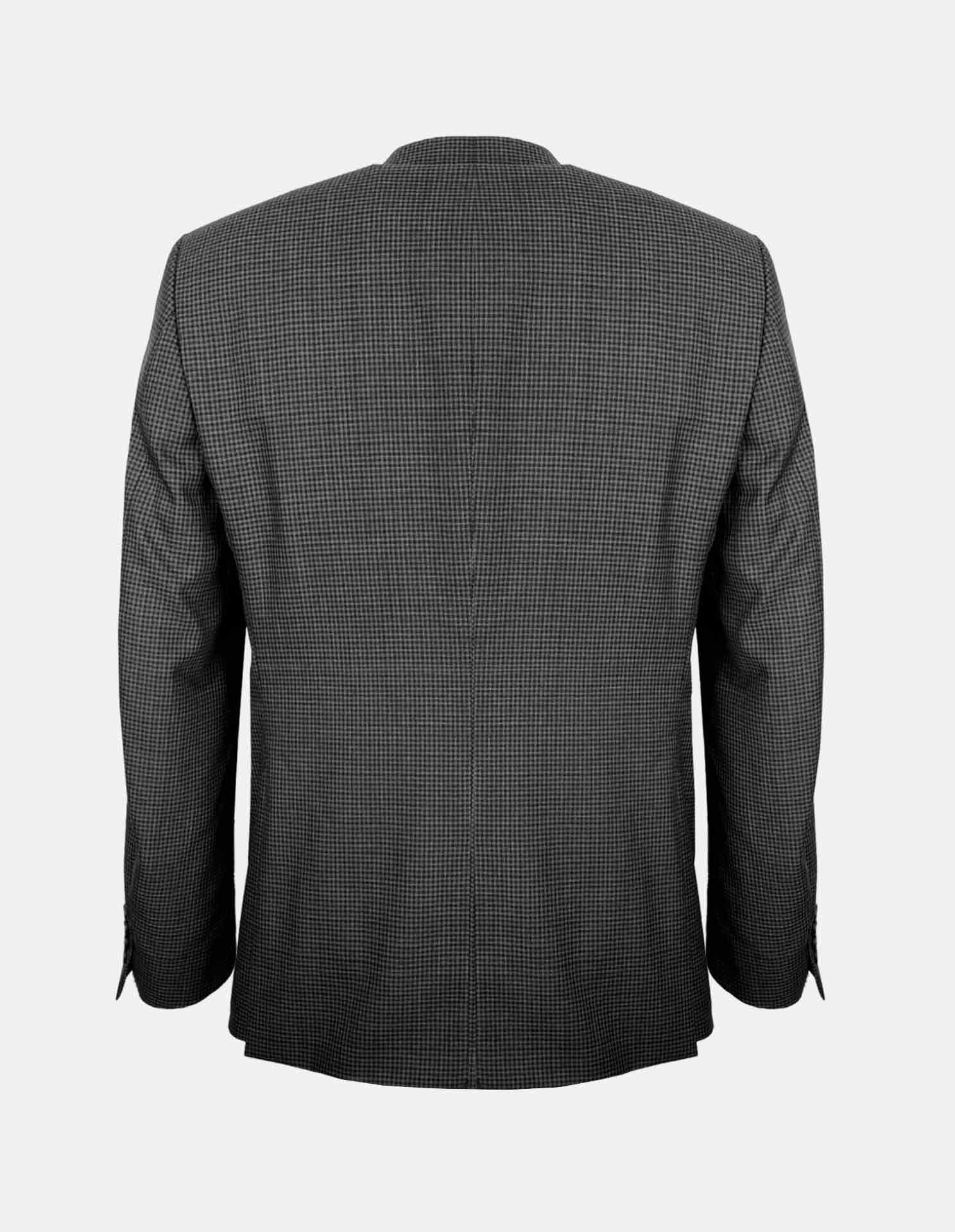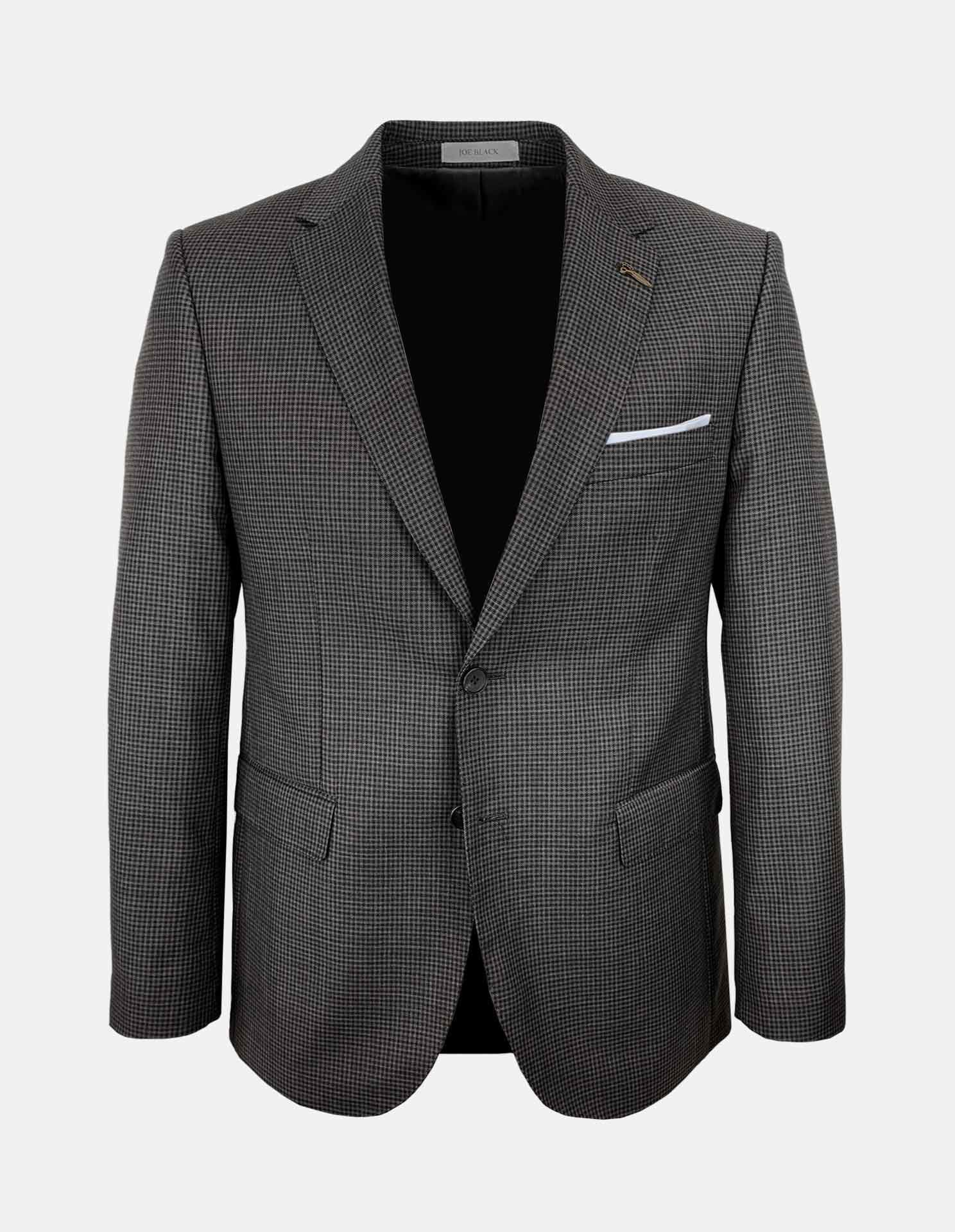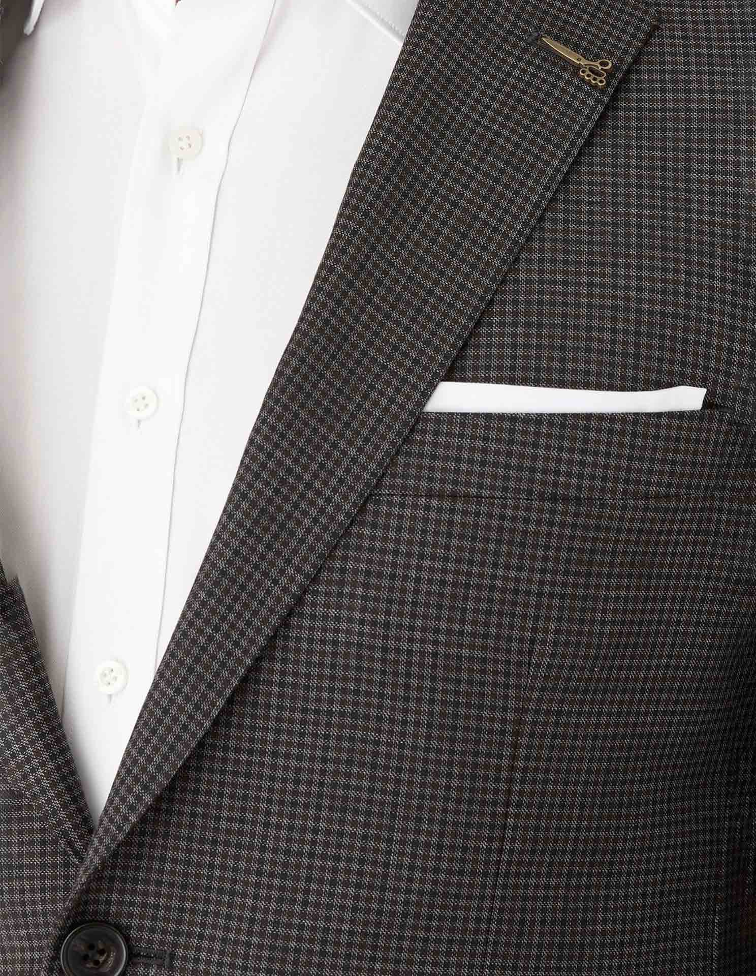 A versatile all-season tailored fit suit, with a grey base fabric, a small scale dark brown and navy overcheck. Features a half canvas front, notch lapel, classic two button front, flap pockets and side vents. Made from 100% wool in the Italian mill Marlene.