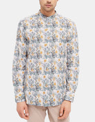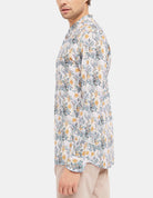 Designed with a mandarin collar, this regular fit cotton long sleeve shirt is covered in floral and fauna reflecting the breezy spirit of summer. Light and relaxed to dressed up or down for the long summer days to night