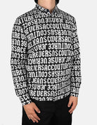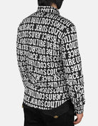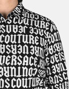 This regular-fit shirt combines streetwear aesthetics with formal cuts. The black cotton long-sleeve shirt features an all-over print of the gothic Versace Jeans Couture logo in white, creating a bold monogram contrast.