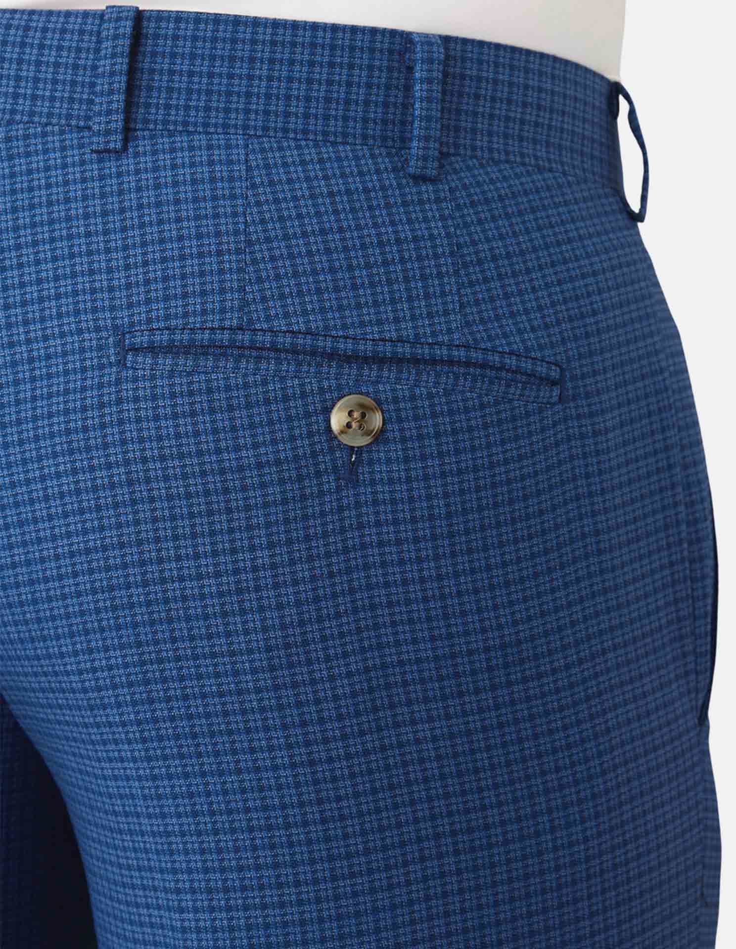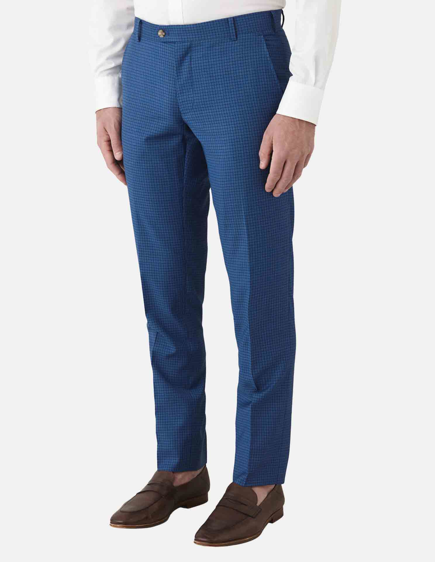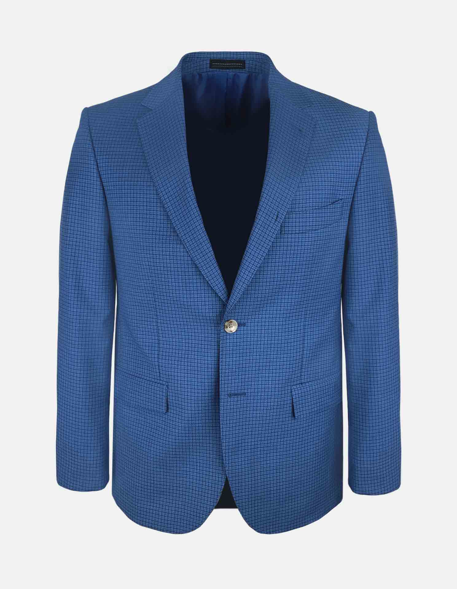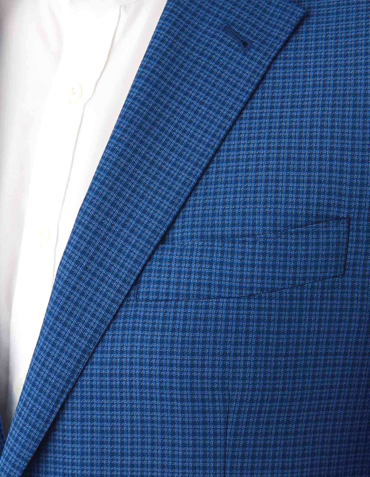 A versatile all-season tailored fit suit, with a blue base fabric, a small scale navy overcheck. Features a half canvas front, notch lapel, classic two button front, flap pockets and side vents.