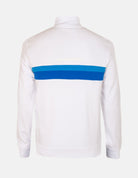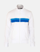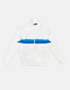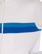 A smart casual jacket in white from Karl Lagerfeld. This jacket features a minimalist approach. Fastened with zip closure, the jacket is detailed with "Karl Lagerfeld" logo on the left chest area, 2 tone blue stripe on the chest. Featuring a white band on both sleeves, paired with ribbed hem and cuff