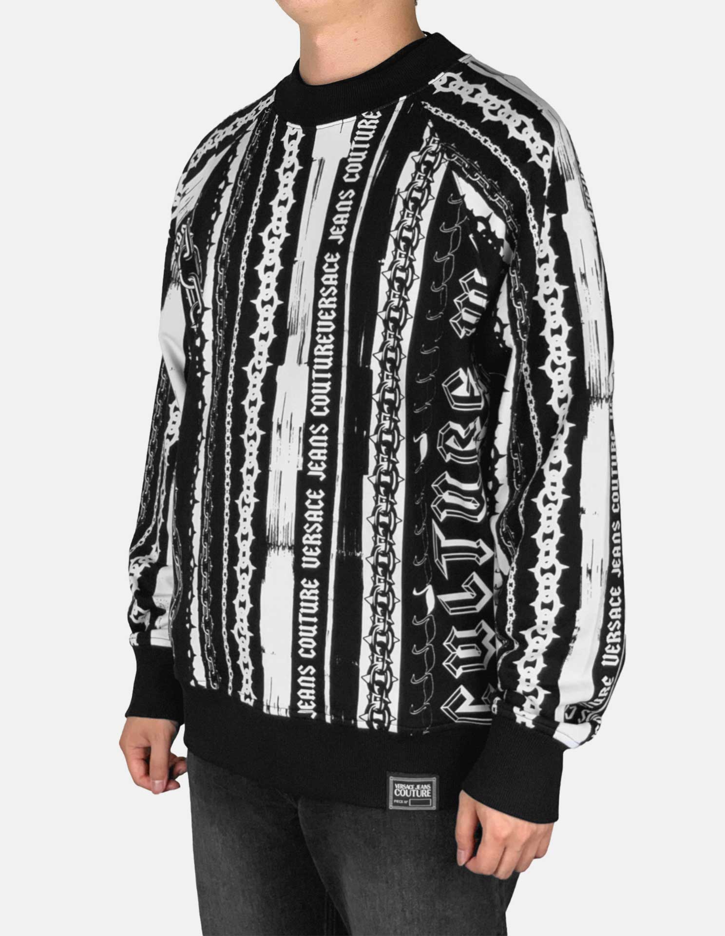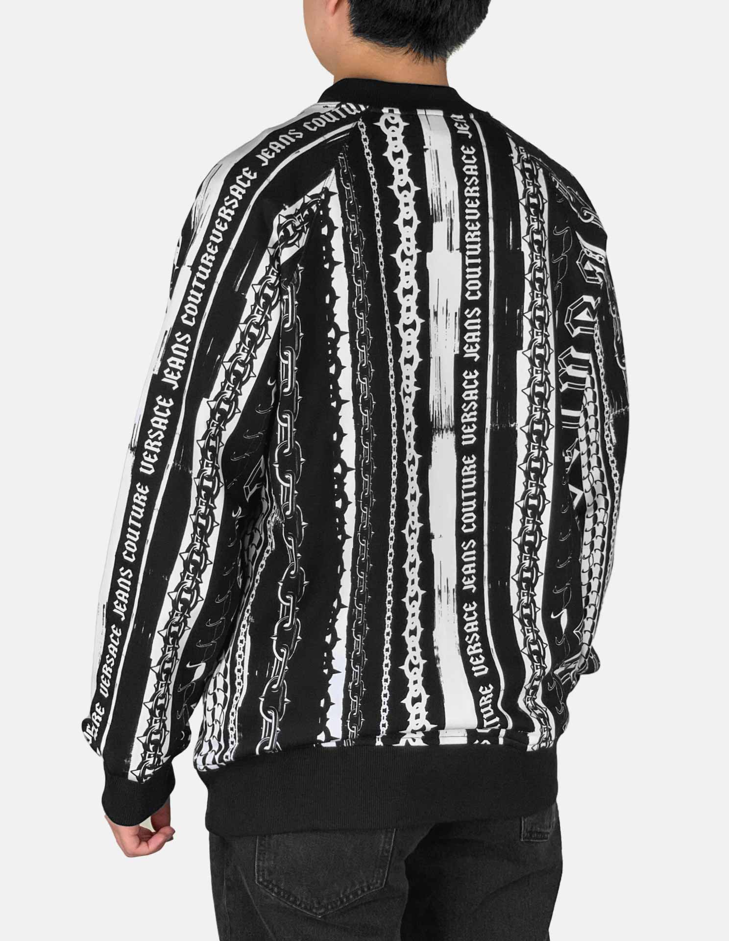 This relaxed-fit cotton sweatshirt features an all-over logo chain stripe print in contrasting black and white. A signature Versace Jeans Couture logo tag at the bottom seam adds the finishing touch to this statement piece.