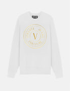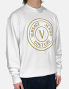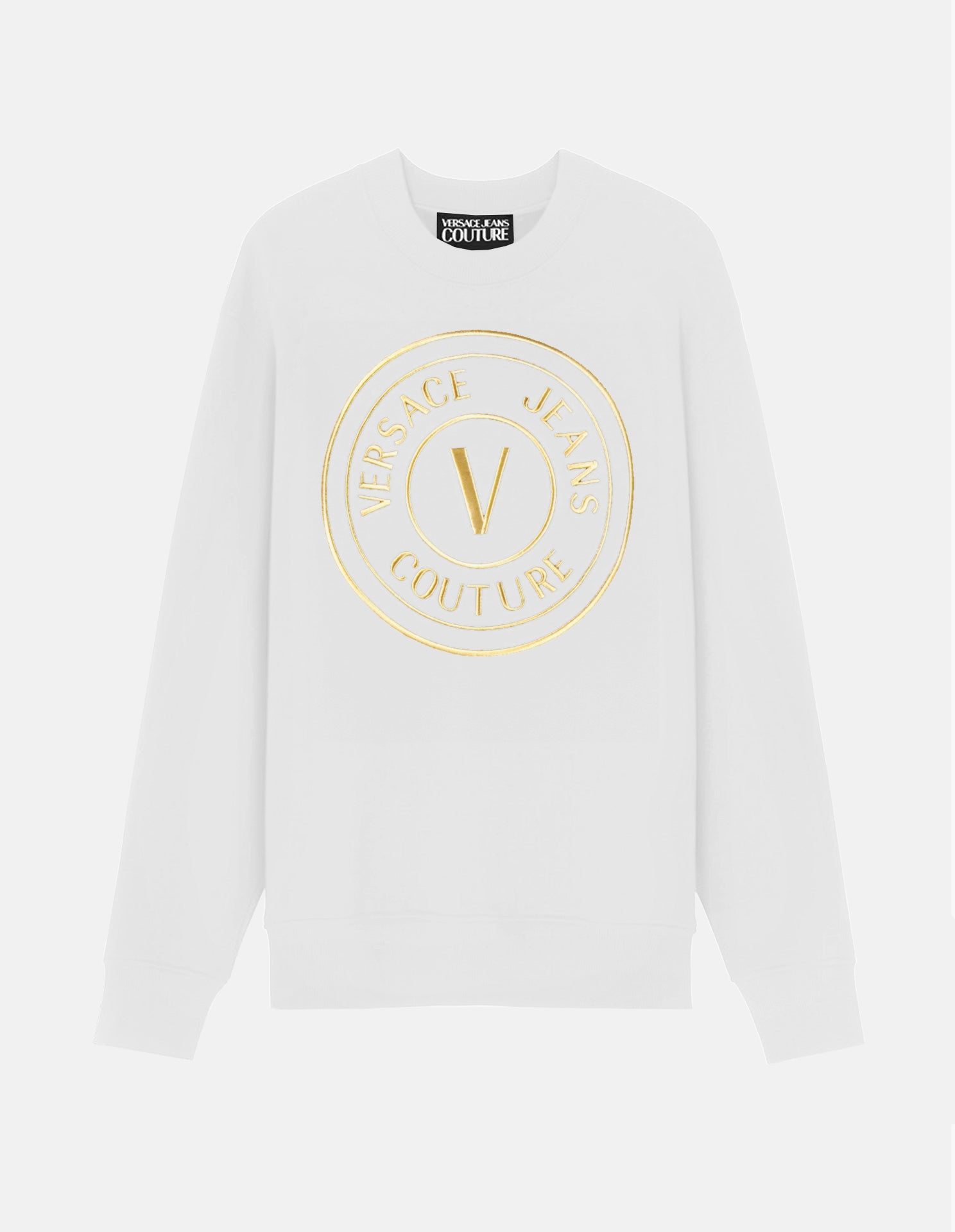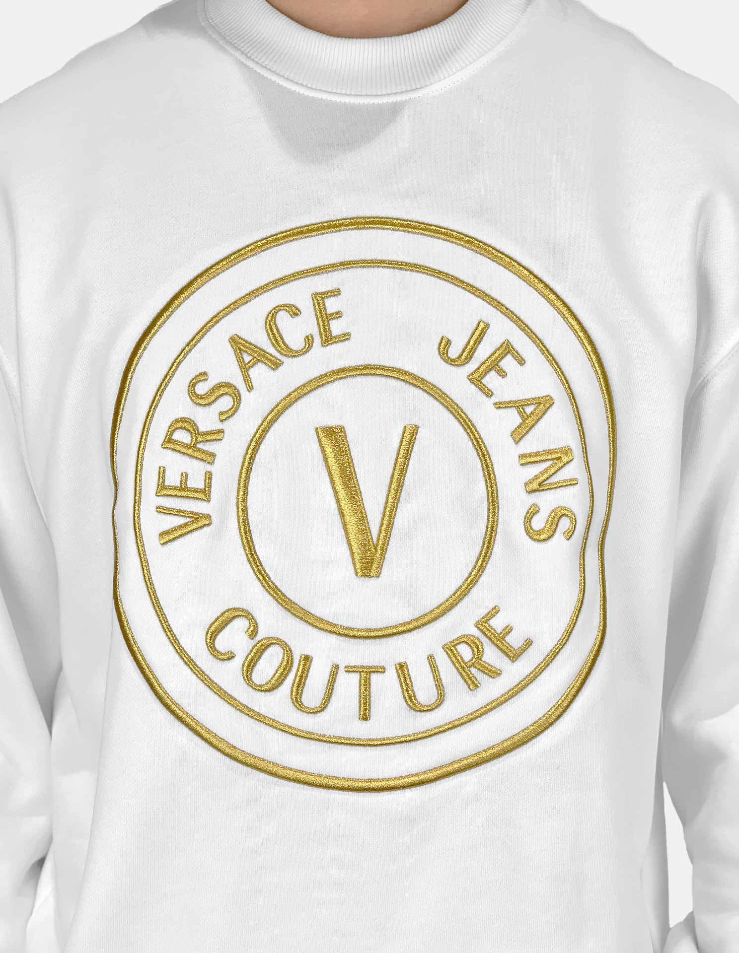 A fresh Versace take on the V-Emblem Sweatshirt, the contrasting 3-D embroidered distinctive emblem stands out against the white regular fit sweatshirt to keep true to the Versace Jeans Couture gold essence