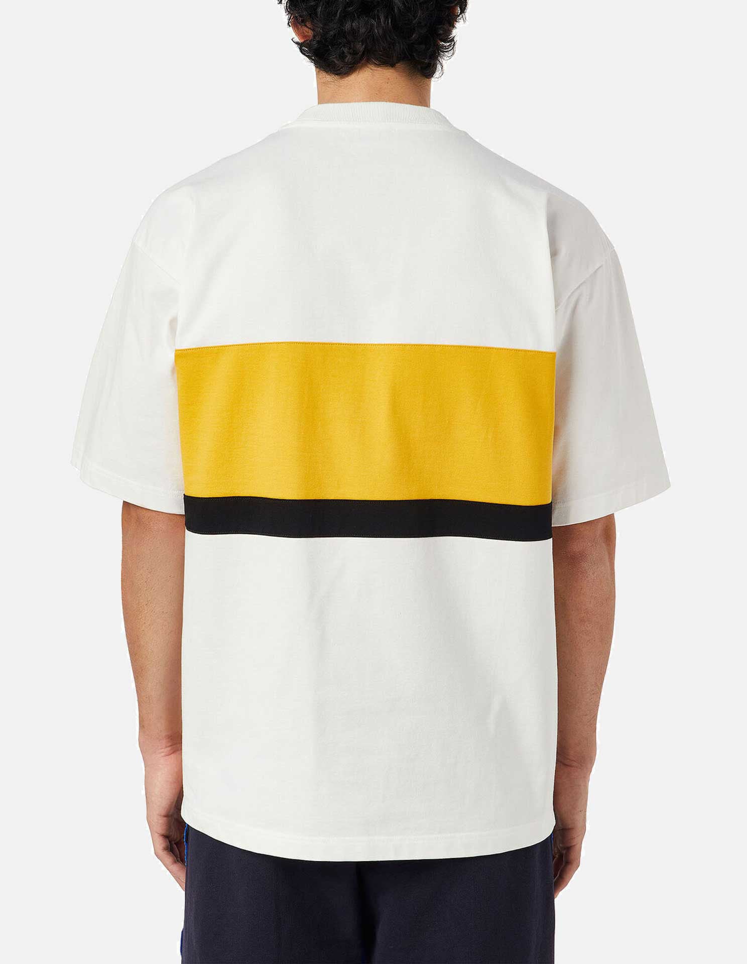 Beige loose-fit T-shirt cut from cotton jersey with a substantial hand feel. The style is panelled with bicolour stripes and has a bold Diesel Denim Division logo appliquéd and embroidered on the front.