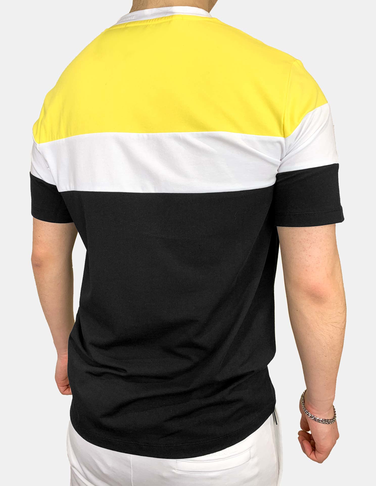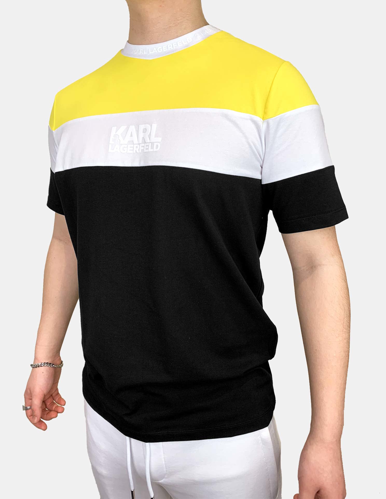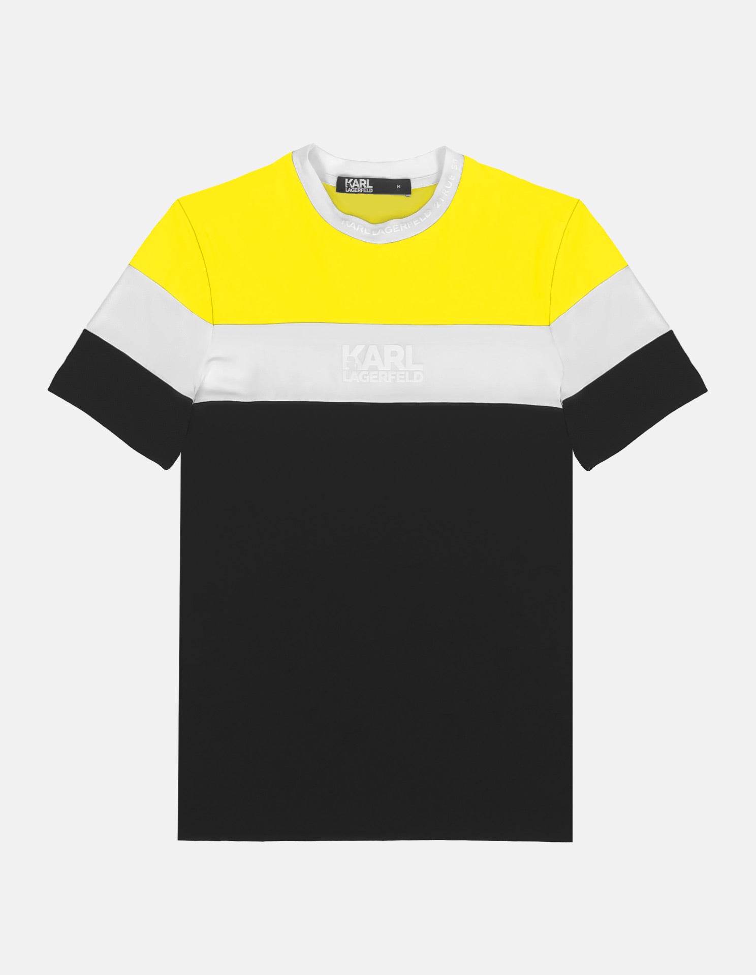 This light weight Karl Lagerfeld tee features contrasting striped layers of yellow, white and black with an embossed Karl logo on the chest and detailing around the left side of the neck of the Paris headquarters "Karl Lagerfeld 21 Rue St Guillaume". Made with 95% Cotton and 5% Elastane