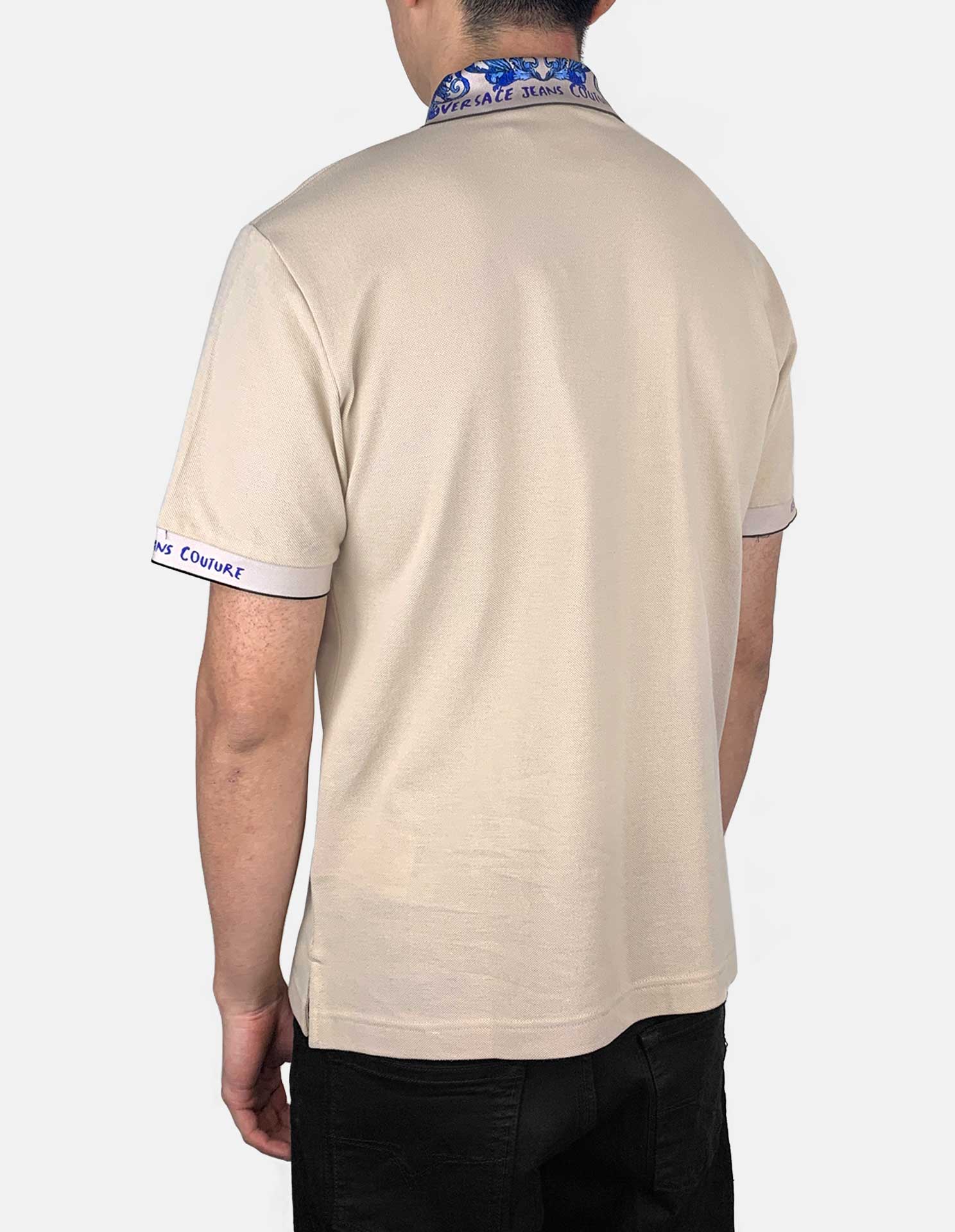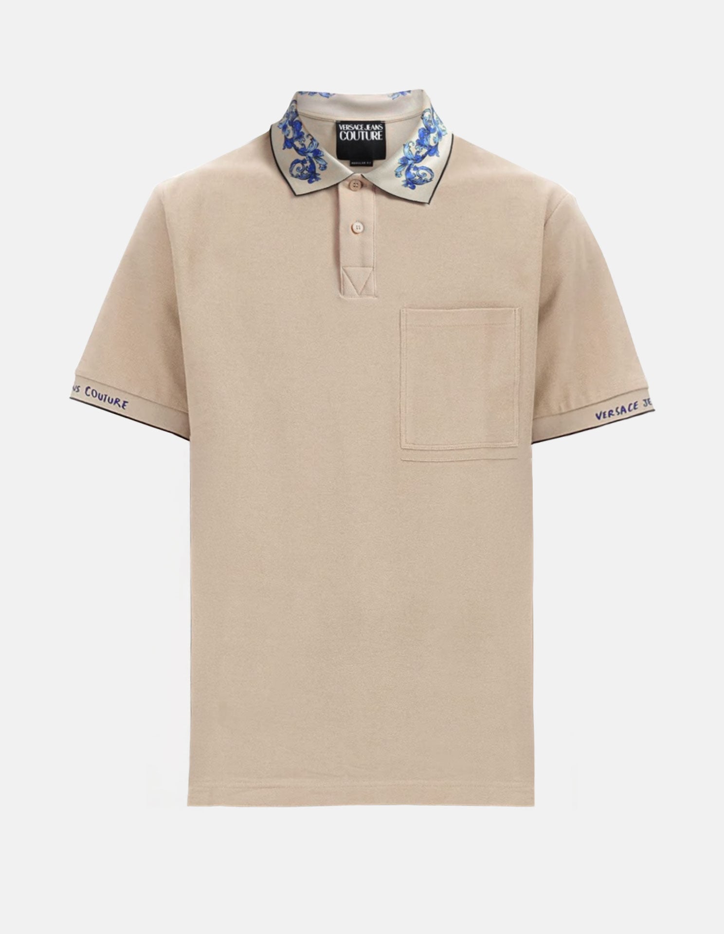 This beige polo shirt strikes the perfect balance between refined simplicity and signature Versace flair. Cut from breathable cotton piqué, it features a structured silhouette with a chest pocket and classic button placket. The standout detail is the ornate baroque embroidery in deep blue adorning the collar, transforming the polo into a subtle statement piece. Finishing touches include contrast piping and logo embroidery on the cuffs, elevating this everyday essential into a look that’s effortlessly sophisticated with a touch of luxury.
