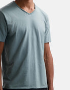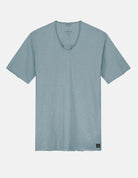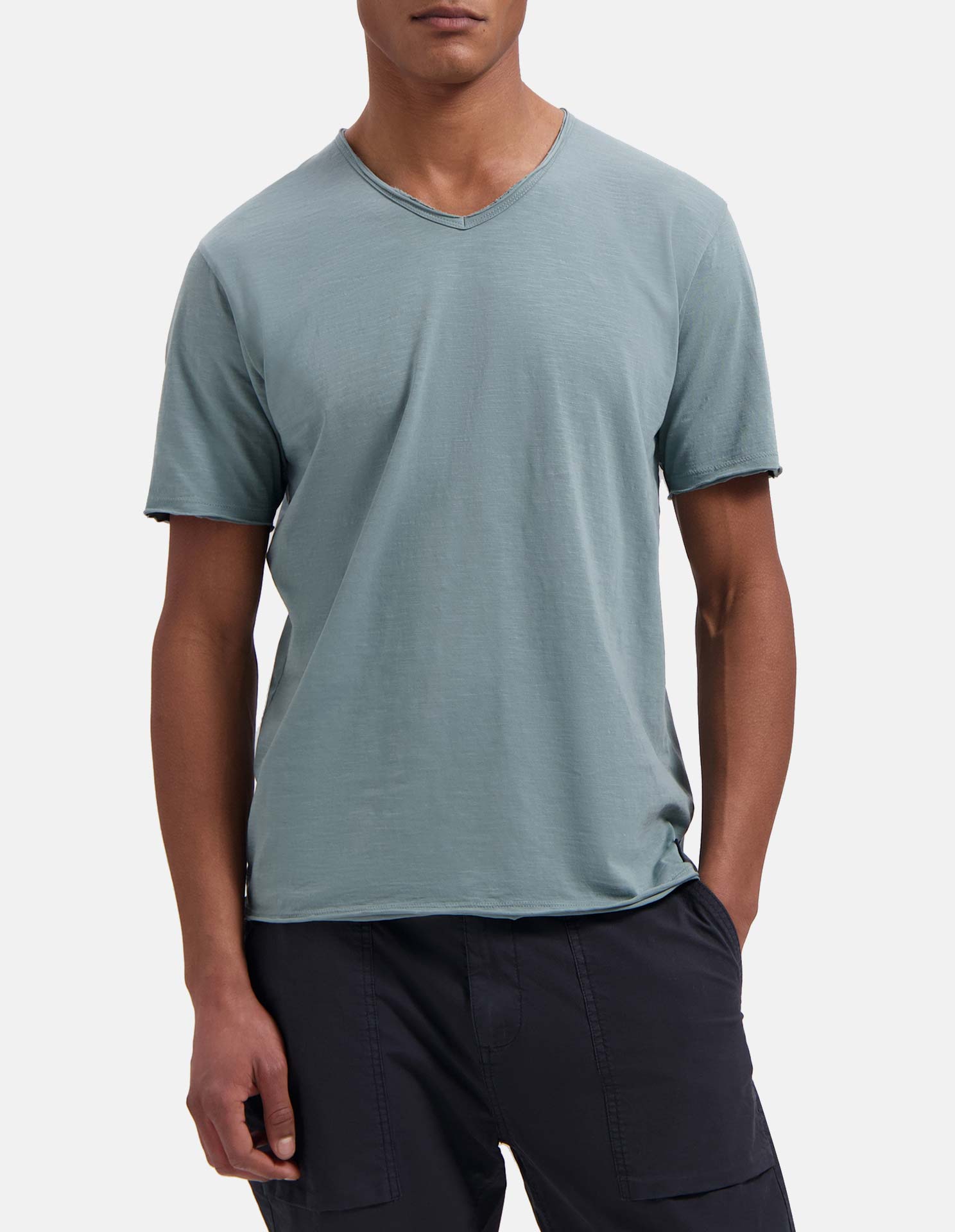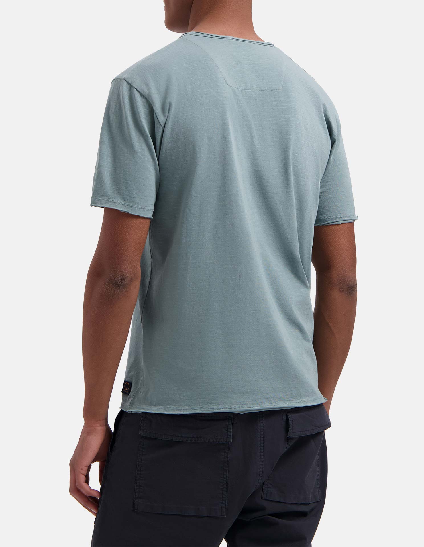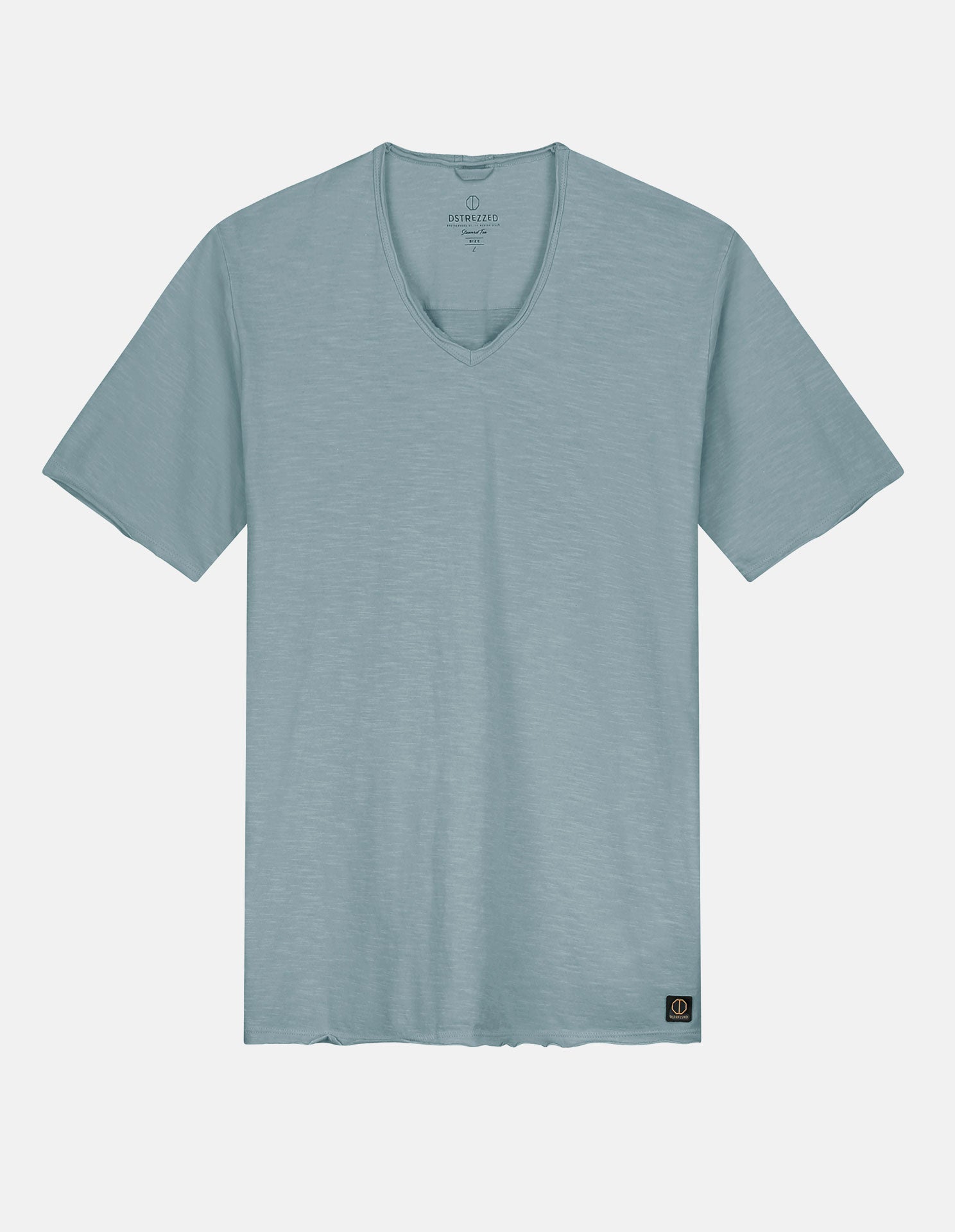 Crafted from sustainable slub textured jersey BCI cotton, this v-neck regular fit teal t-shirt is a refined silhouette with that Dstrezzed touch of worn details for that edge twist on a modern staple