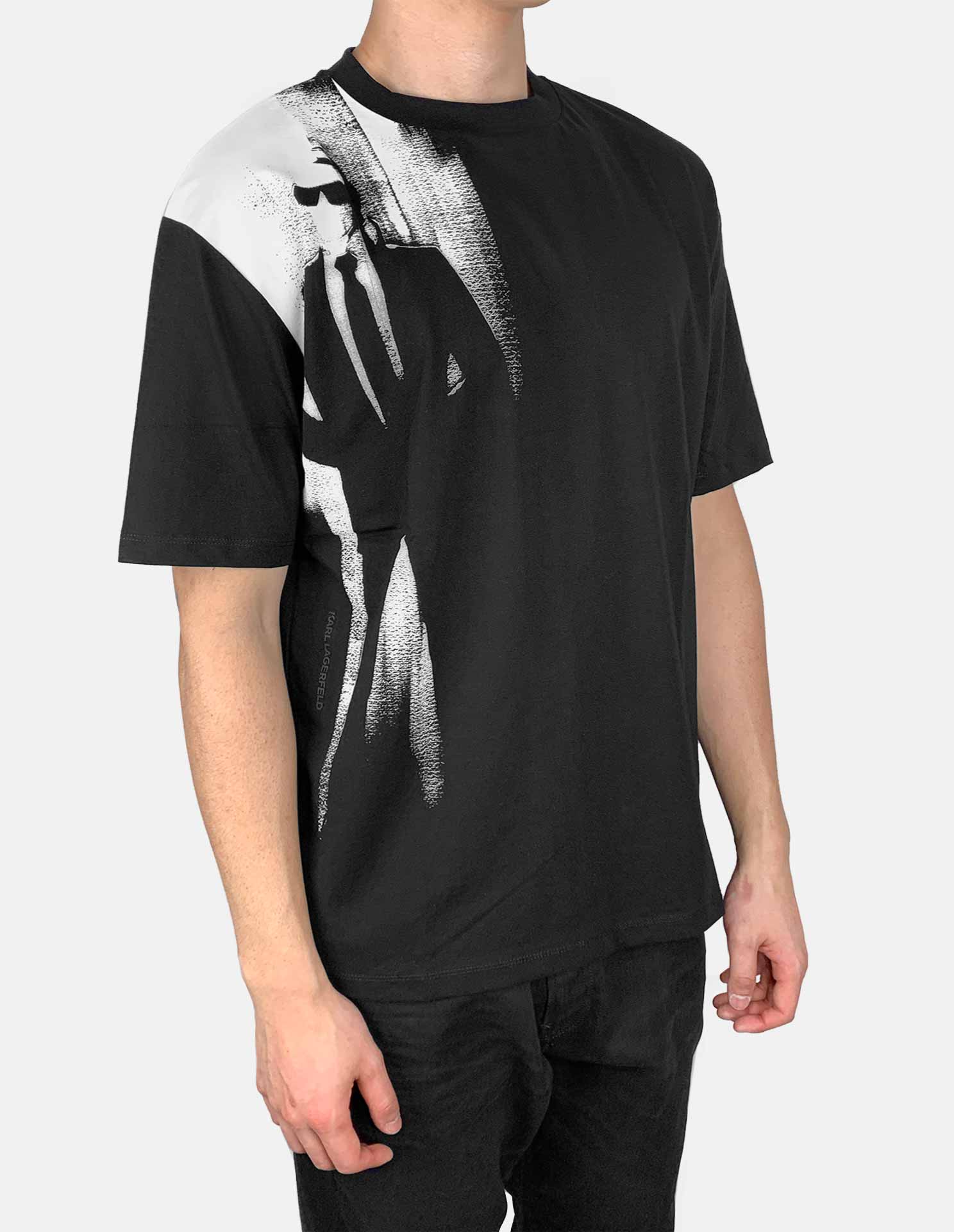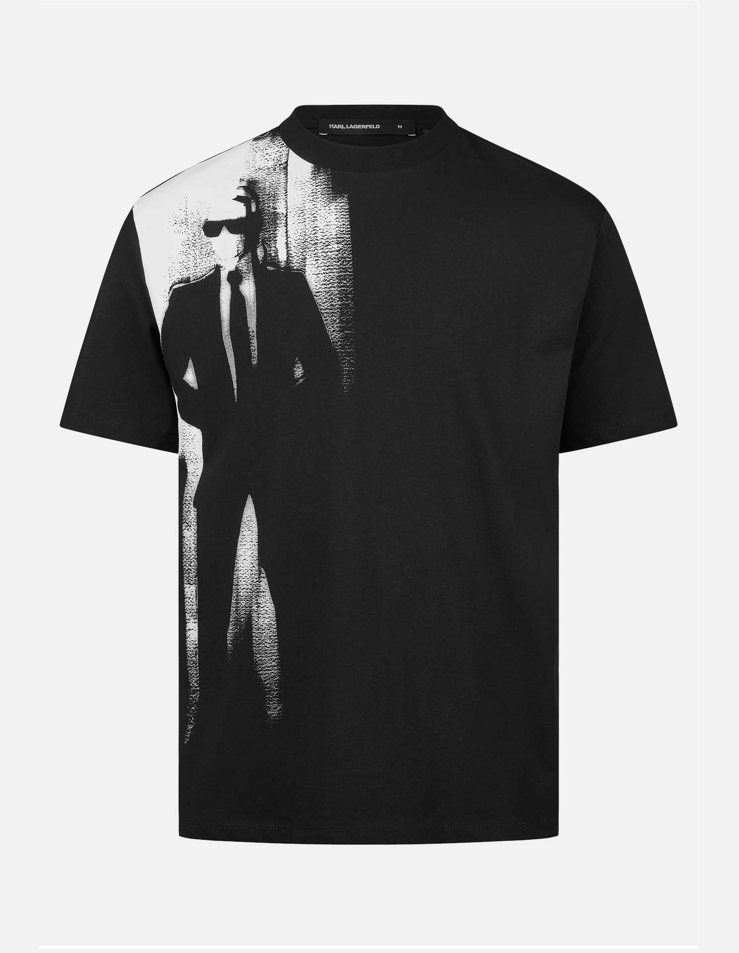 Bold and unmistakably Karl, this black graphic tee captures the designer’s iconic silhouette in a high-contrast monochrome print. Crafted from premium cotton, it combines an elevated art-house aesthetic with everyday wearability. The abstract shadow portrait—half concealed, half revealed—evokes Lagerfeld’s mysterious allure and avant-garde sensibility. A modern statement piece that pairs effortlessly with tailored denim or sleek joggers for a confident, fashion-forward look.