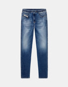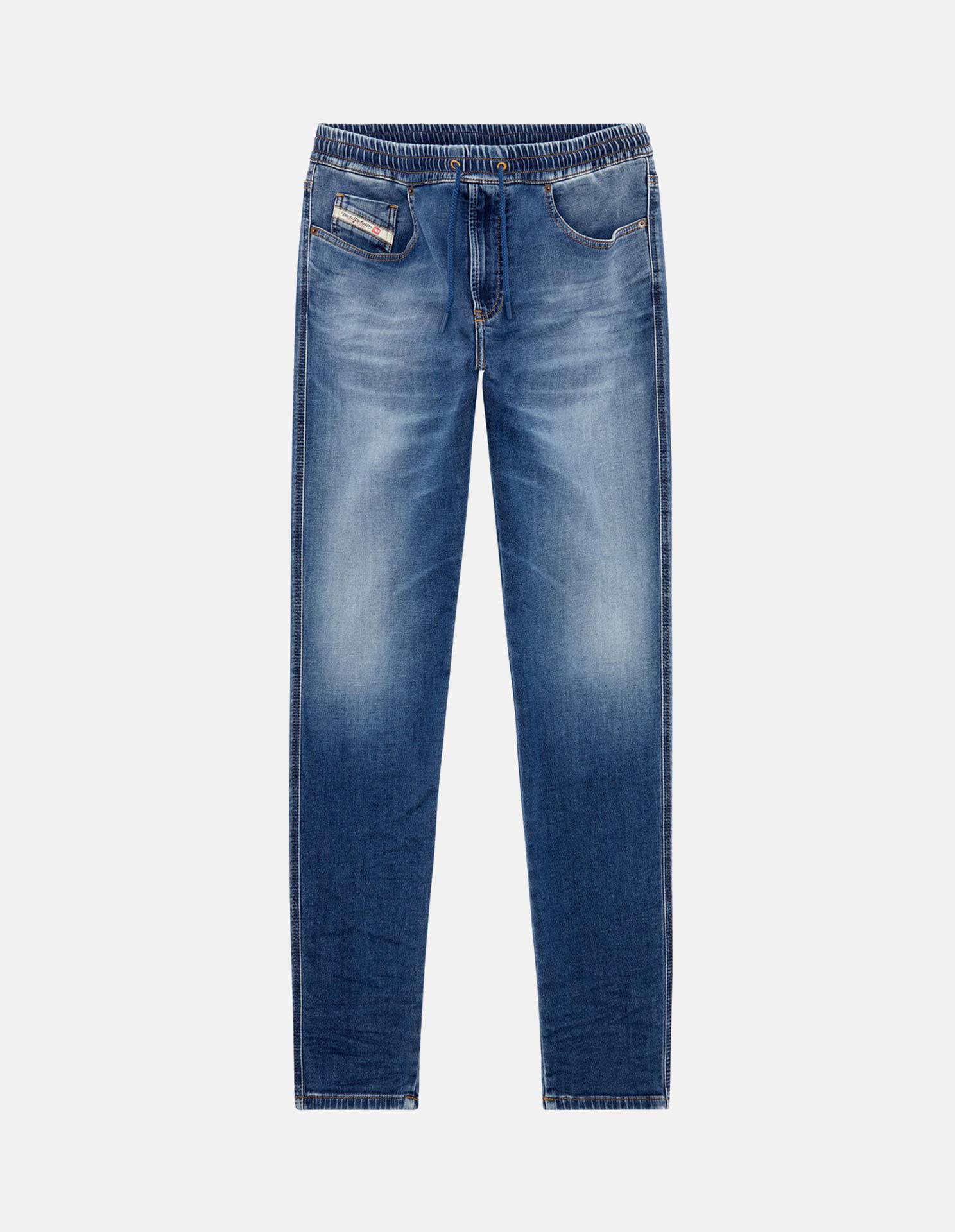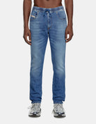 Made for the maximum comfort, this slim-fit Jogg Jean features a drawstring elastic waistband and treated with the signature Medium Blue DNA wash and Diesel jeans treatments and embroidered with red D logo to balance comfort and style