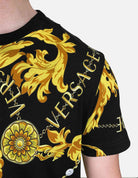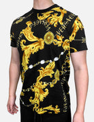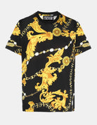 Slim fitting Cotton T-shirt featuring the new Versace Jeans Couture Chain Baroque print which incorporates gold baroque leaves and pearl chains in the distinct ornate style of Versace. An essential addition for this season