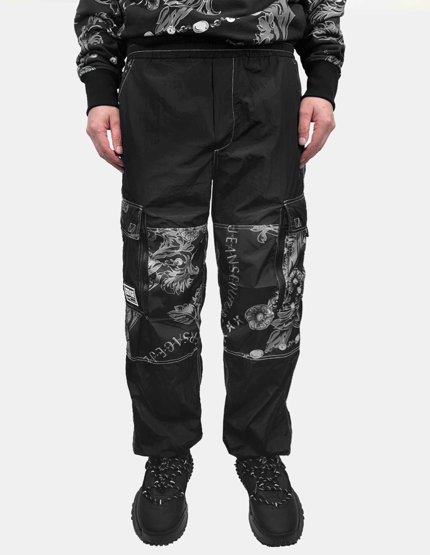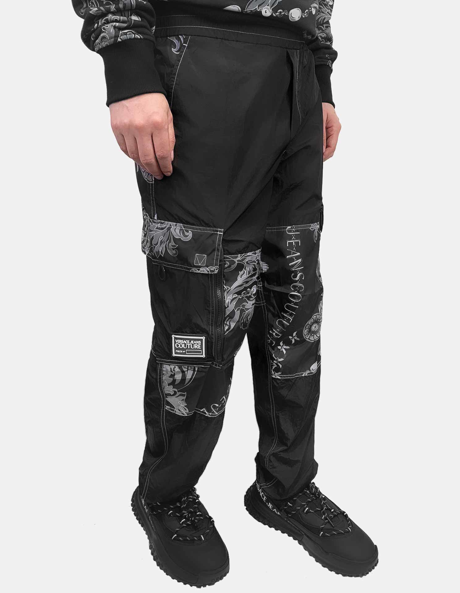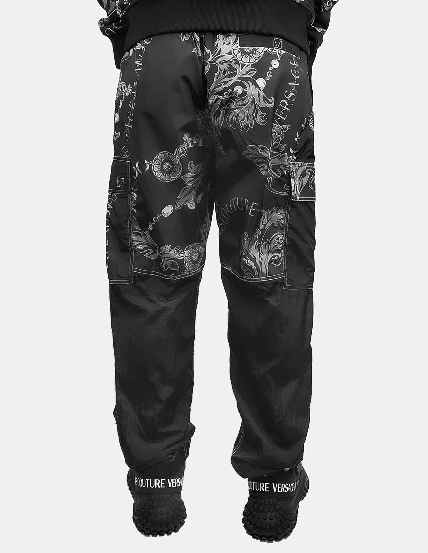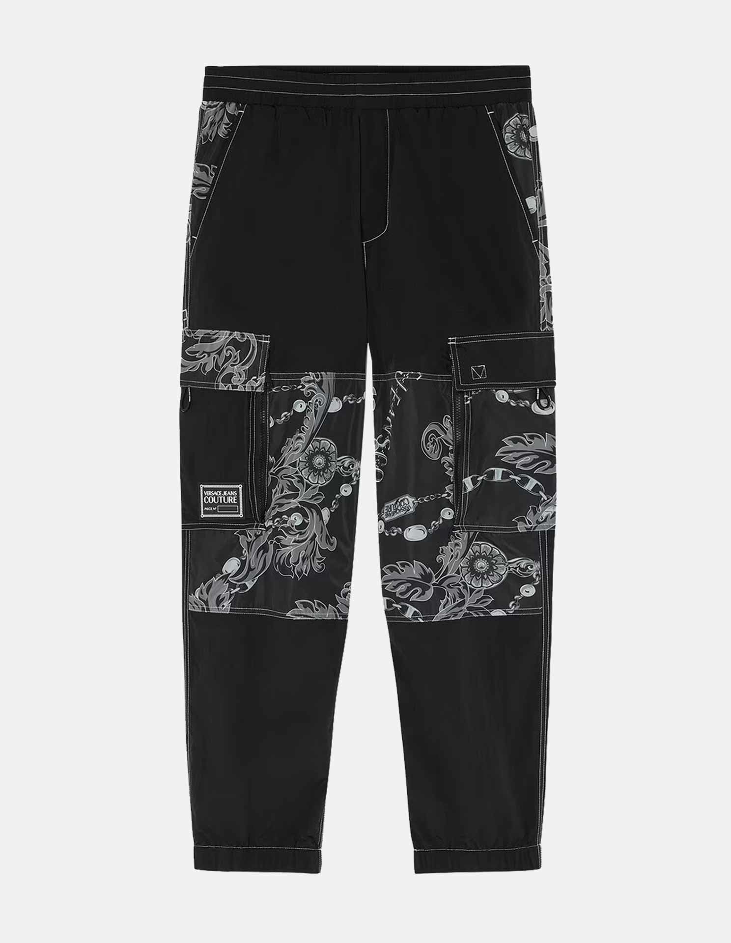 These technical nylon cargo pants are embellished with the new chain couture print in grey from Versace. Featuring a quick drawstring inside the waist and made from ripstop panels. These pants also include side cargo pockets and elastic waist and hem.