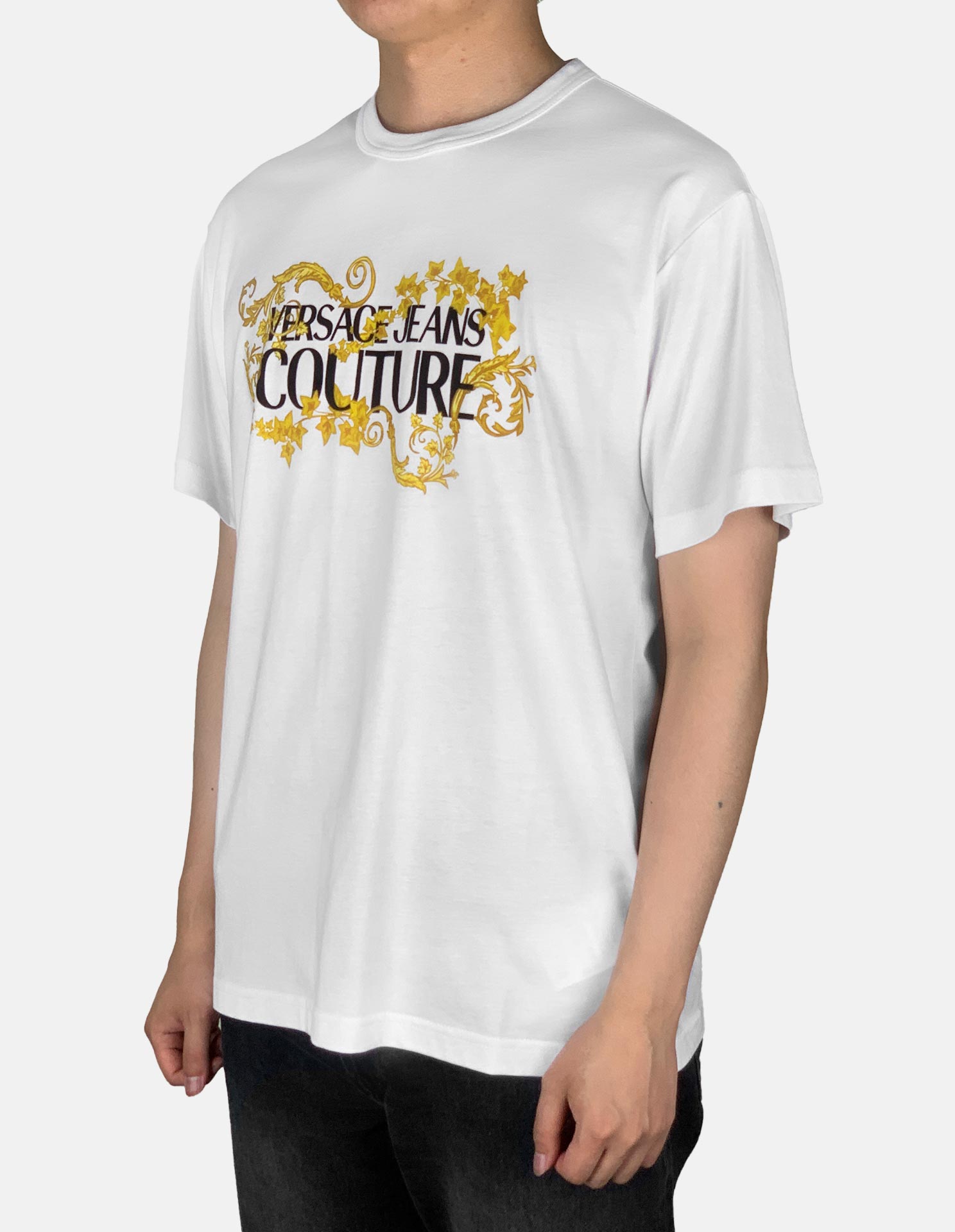 This slim-fit, white jersey cotton t-shirt features a gold enchanted forest take on the distinctive Baroque and Versace Jeans Couture logo, effortlessly elevating a wardrobe staple with a Versace Jeans Couture touch.