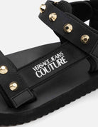 Bold and unapologetic, these Versace Jeans Couture sandals fuse streetwear ease with high-fashion rebellion. Crafted with sturdy black straps, they’re adorned with gleaming gold-tone pyramid studs that bring a striking edge to their utilitarian silhouette. The cushioned sole ensures comfort, while the iconic Versace Jeans Couture logo stamped across the strap adds a signature touch. Perfect for those who want to command attention without sacrificing everyday wearability.