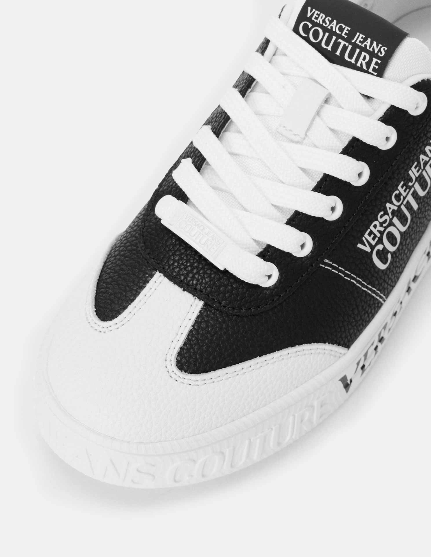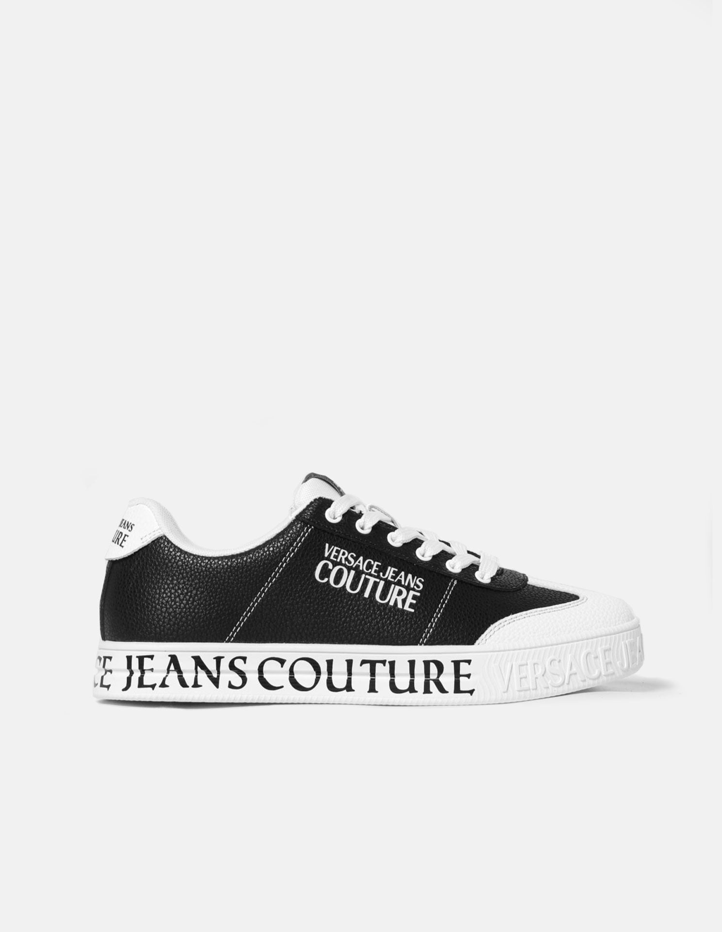 Versatile and sleek, this sneaker features a distinctly luxe leather grain texturing, with the black upper contrasted by white logo detailing, atop a clean white court sneaker base. Embossed rubber logo detail on the outsole tip, accompanied by bold black lettering on the sides, elevates the piece with a distinctive VJC edge. A refined silhouette with a distinct street wear attitude, wearable with any outfit.