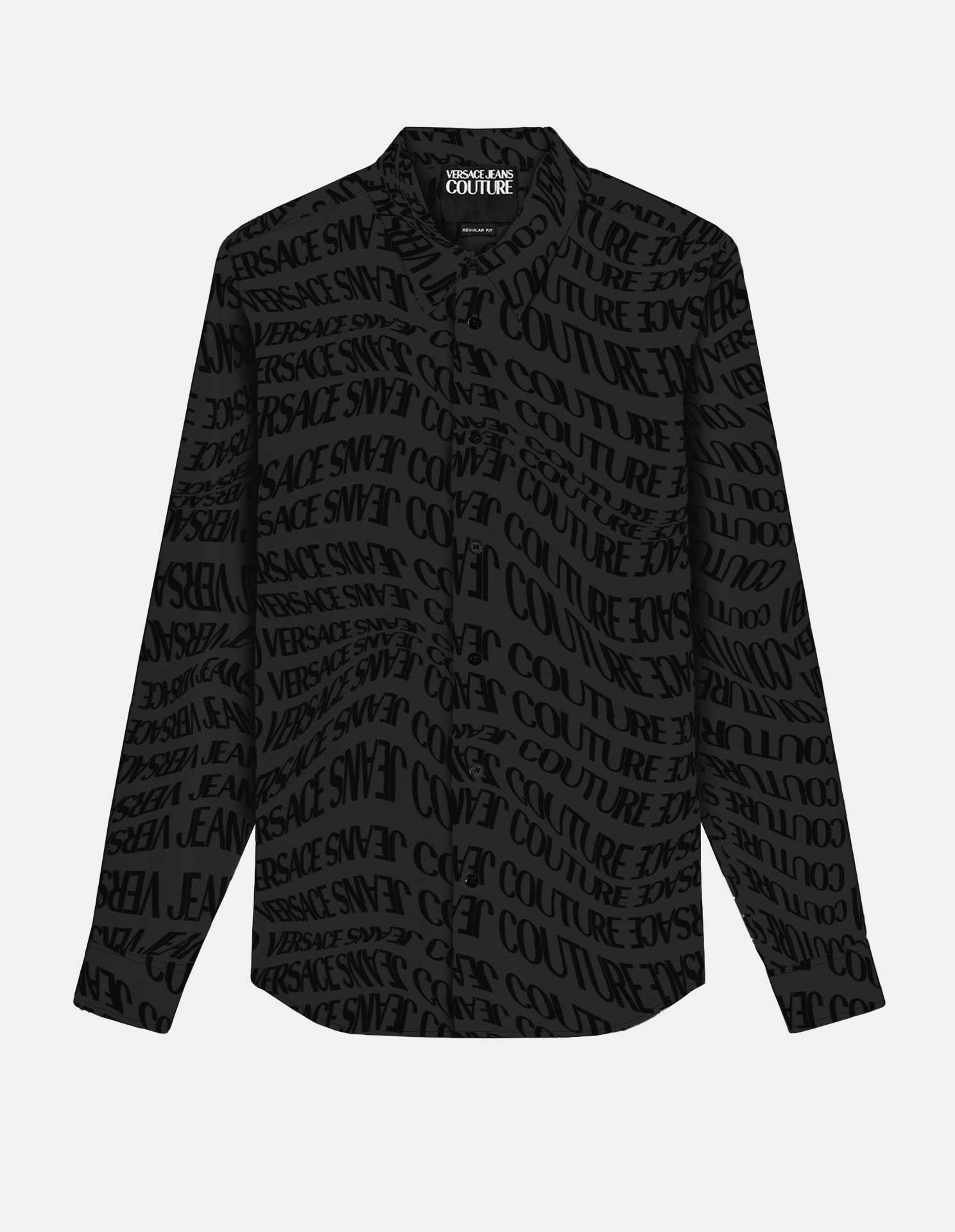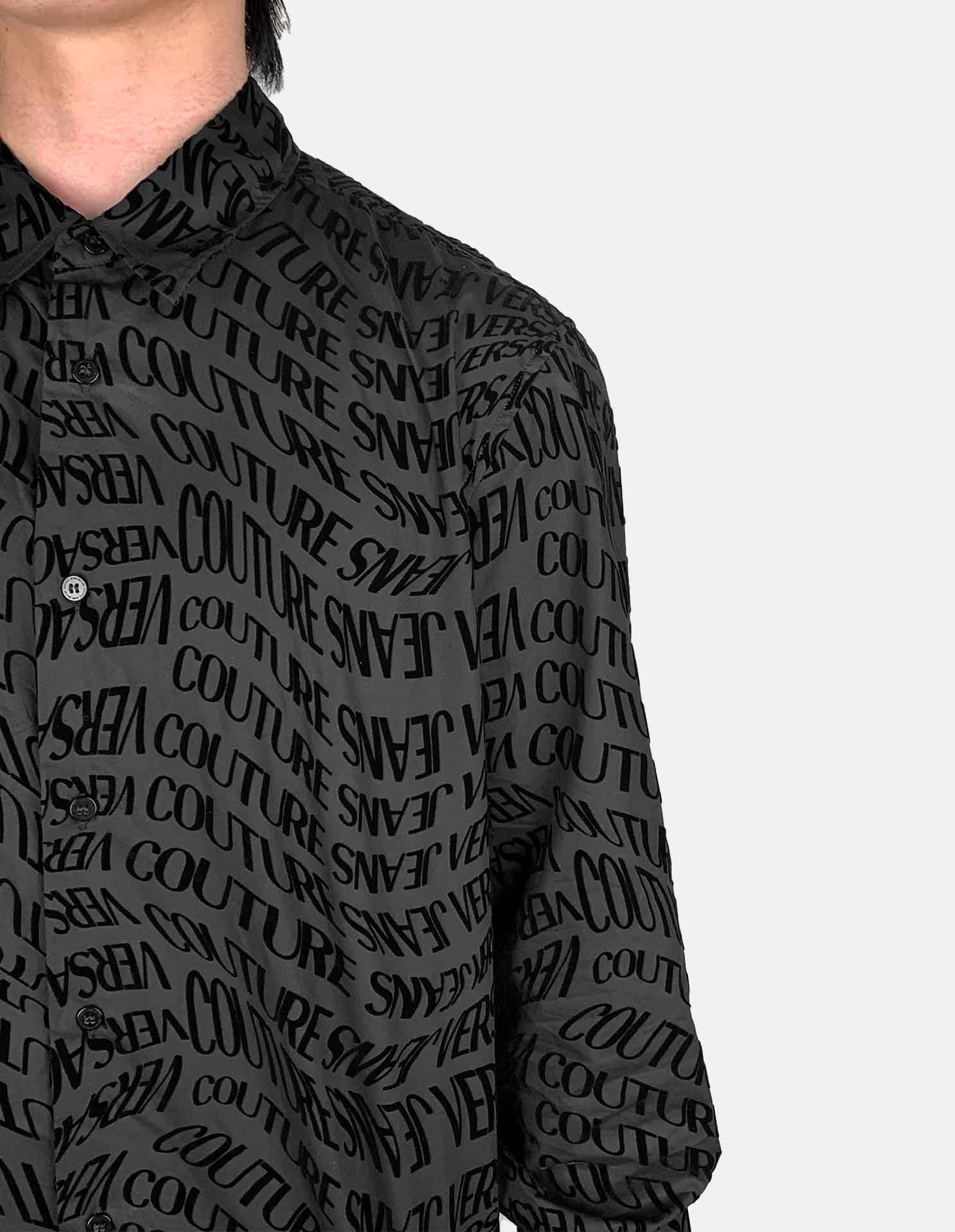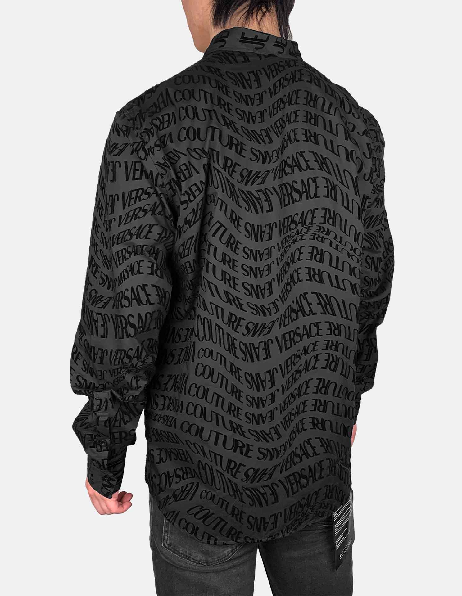 Make a bold statement with this luxurious long sleeve shirt, featuring an all-over tonal logo pattern, embroidered with a velvet like texture. Crafted from soft, premium fabric, it offers a sleek silhouette with a classic collar, button-front closure, resulting in a contemporary essential for effortless luxury dressing.
