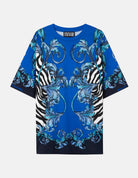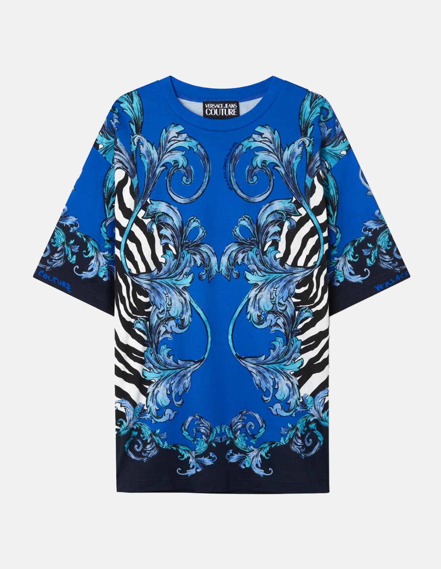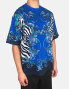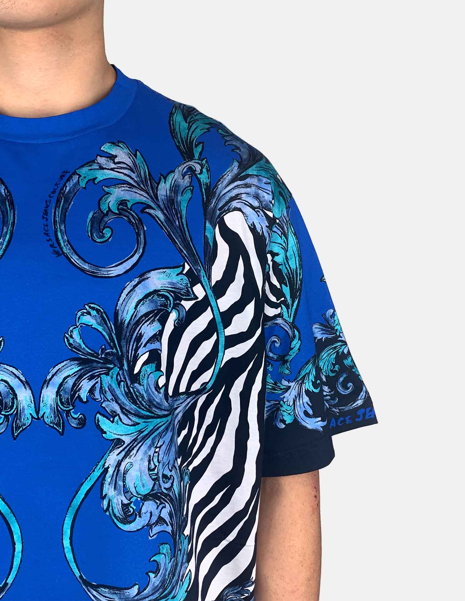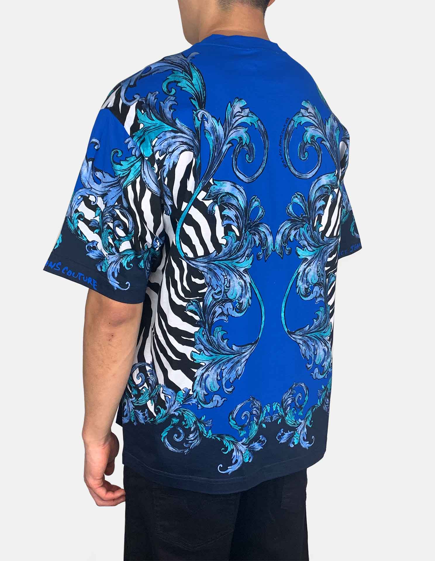 This Versace Jeans Couture T-shirt explodes with statement-making energy, blending the house’s signature baroque flourishes with bold animal print. Set against a striking cobalt blue base, swirling acanthus motifs intertwine with black-and-white zebra accents for a dramatic contrast. Cut in a relaxed fit with a crew neckline, it embodies the brand’s fearless fusion of opulence and streetwear attitude.