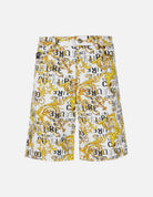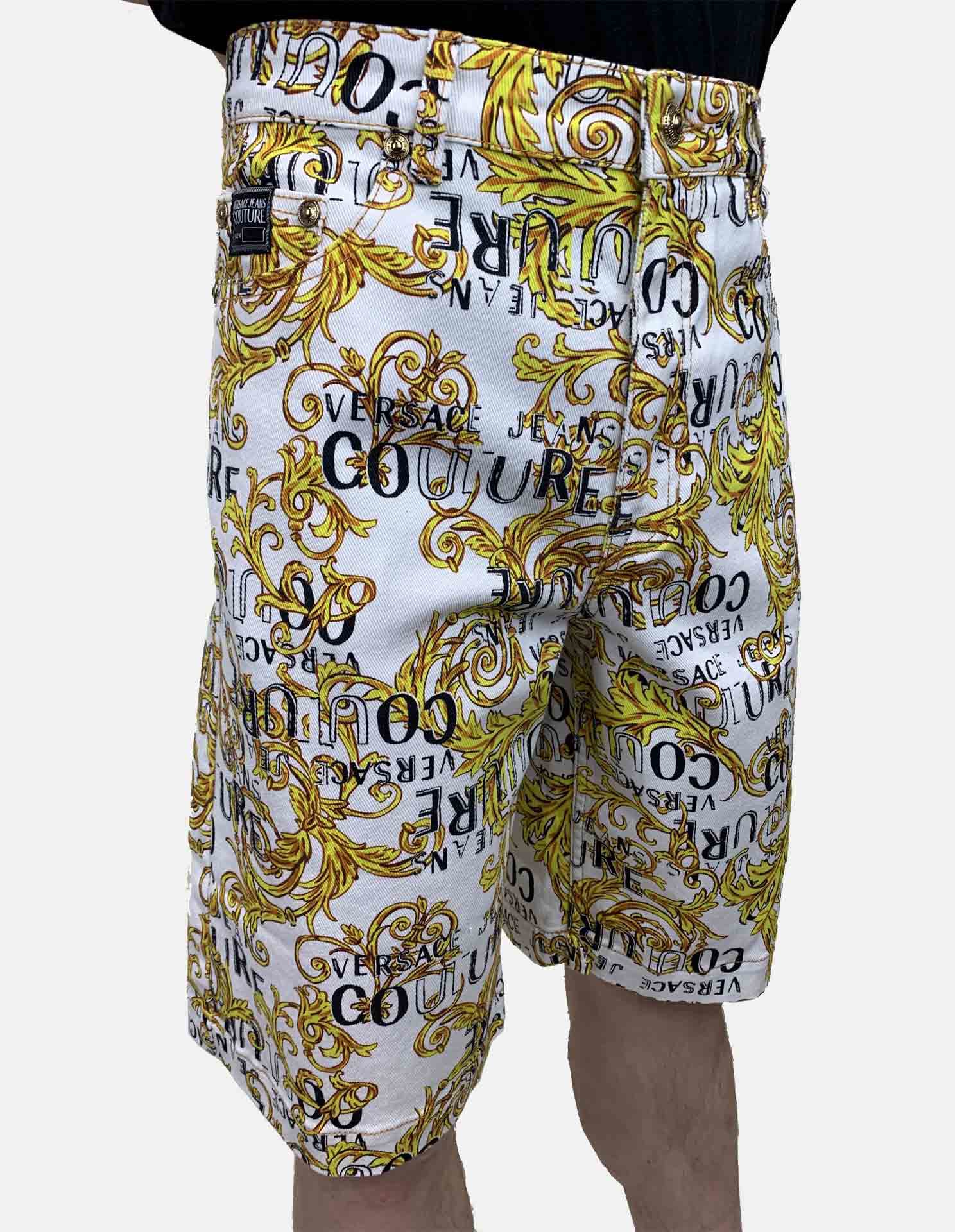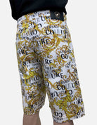 Light weight knee length stretch denim shorts. Featuring an allover new Versace Jeans Couture Logo Baroque print, embellished with gold metallic Versace buttons and a gold & black back patch.