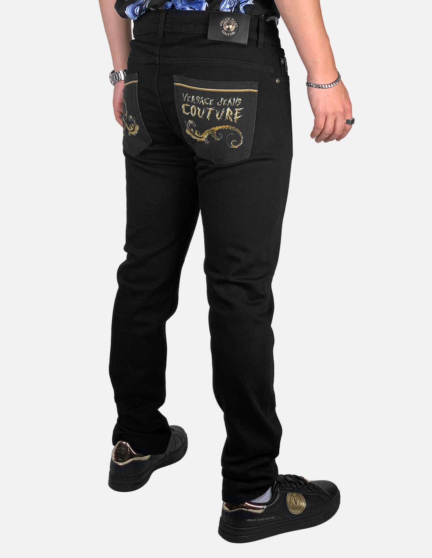 These narrow-fit denim jeans feature a Chromo Couture print with thorny brambles on the back patch pocket. The gold V-Emblem hardware completes the look with a Versace Jeans Couture touch.