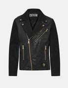 This biker-inspired denim jacket features a front coated faux-leather panel and is accented with gold V-Emblem hardware, embodying the collection's essence of regal rebellion.