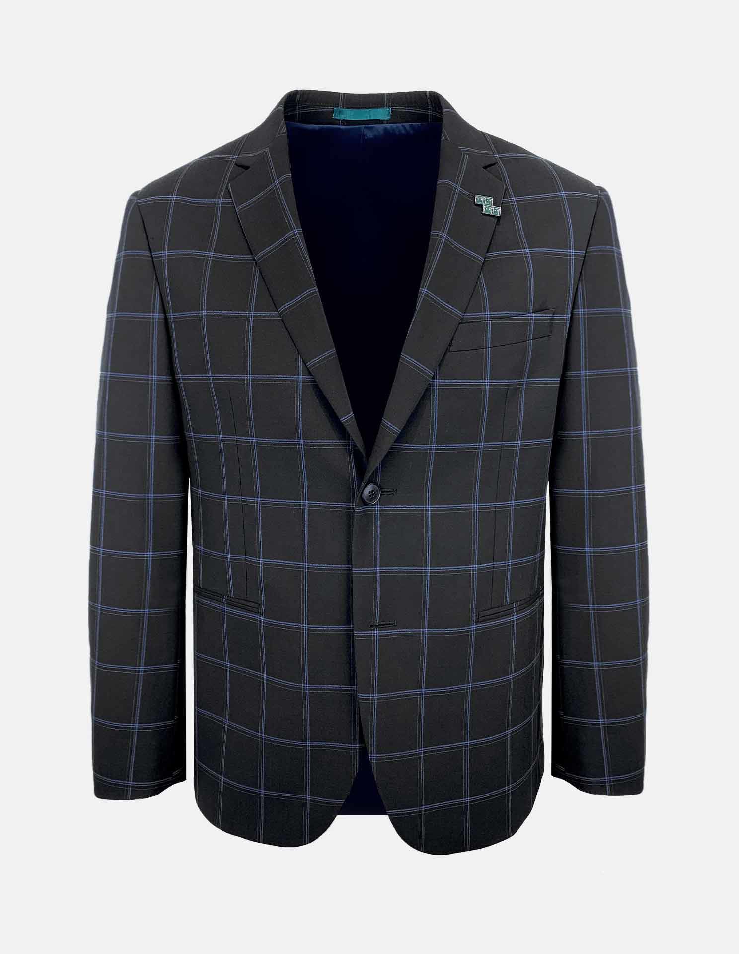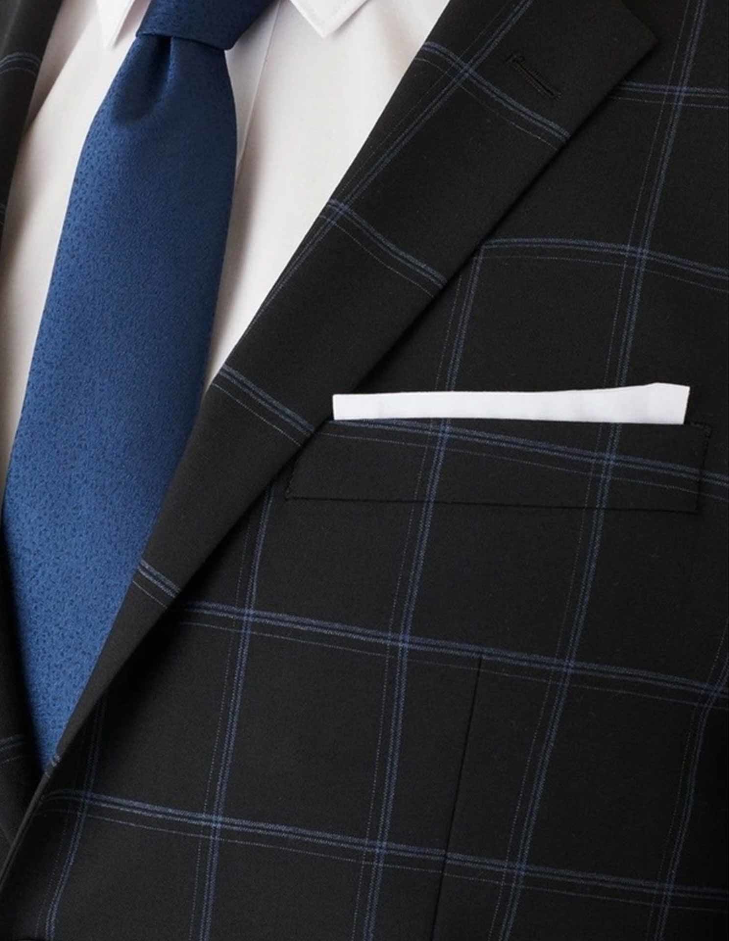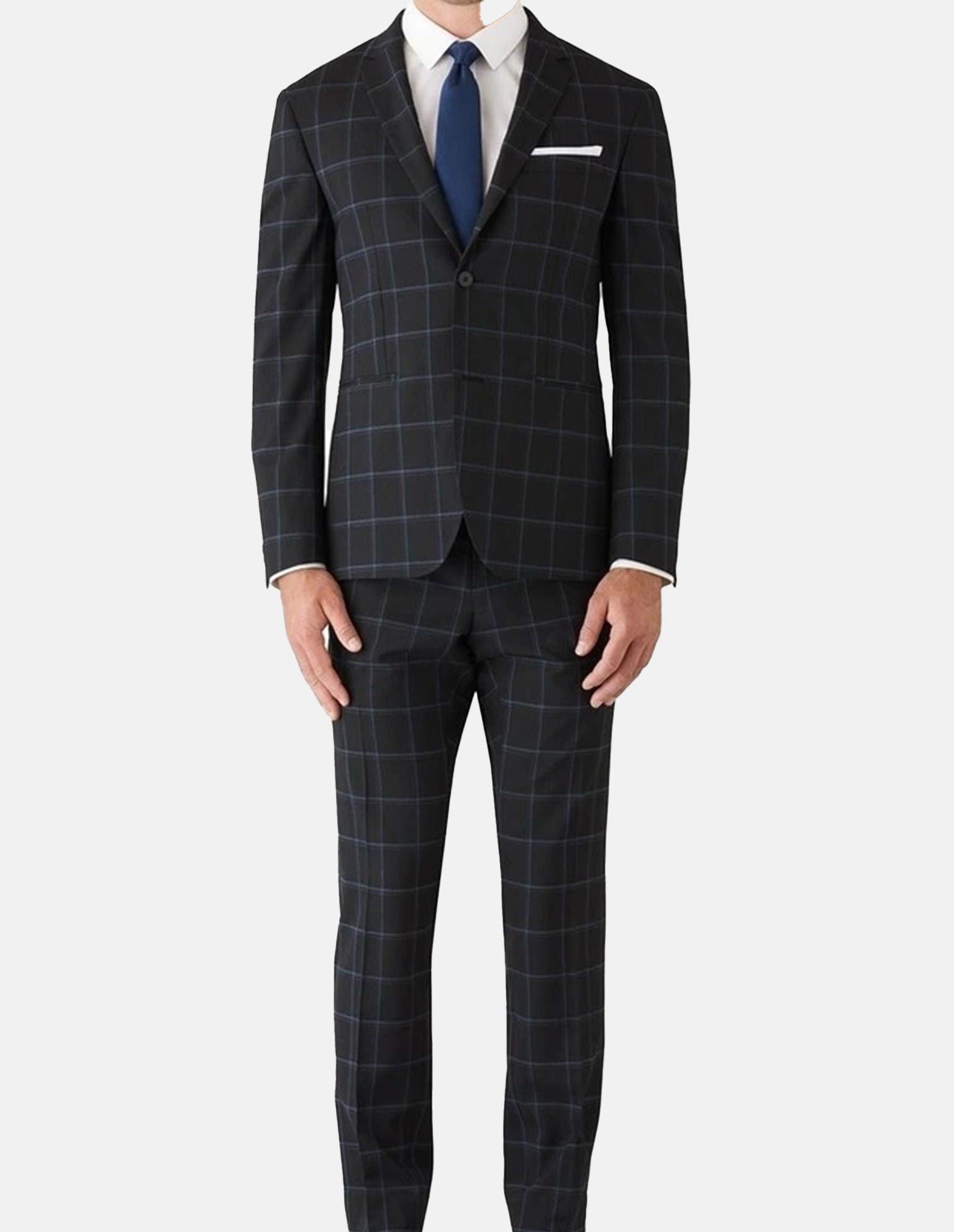A slim black check suit crafted for performance, provides extra flex and added stretch for everyday wear. Featuring a soft construction, stretch lining, jet pockets and two side vents this suit mimics your every movement.