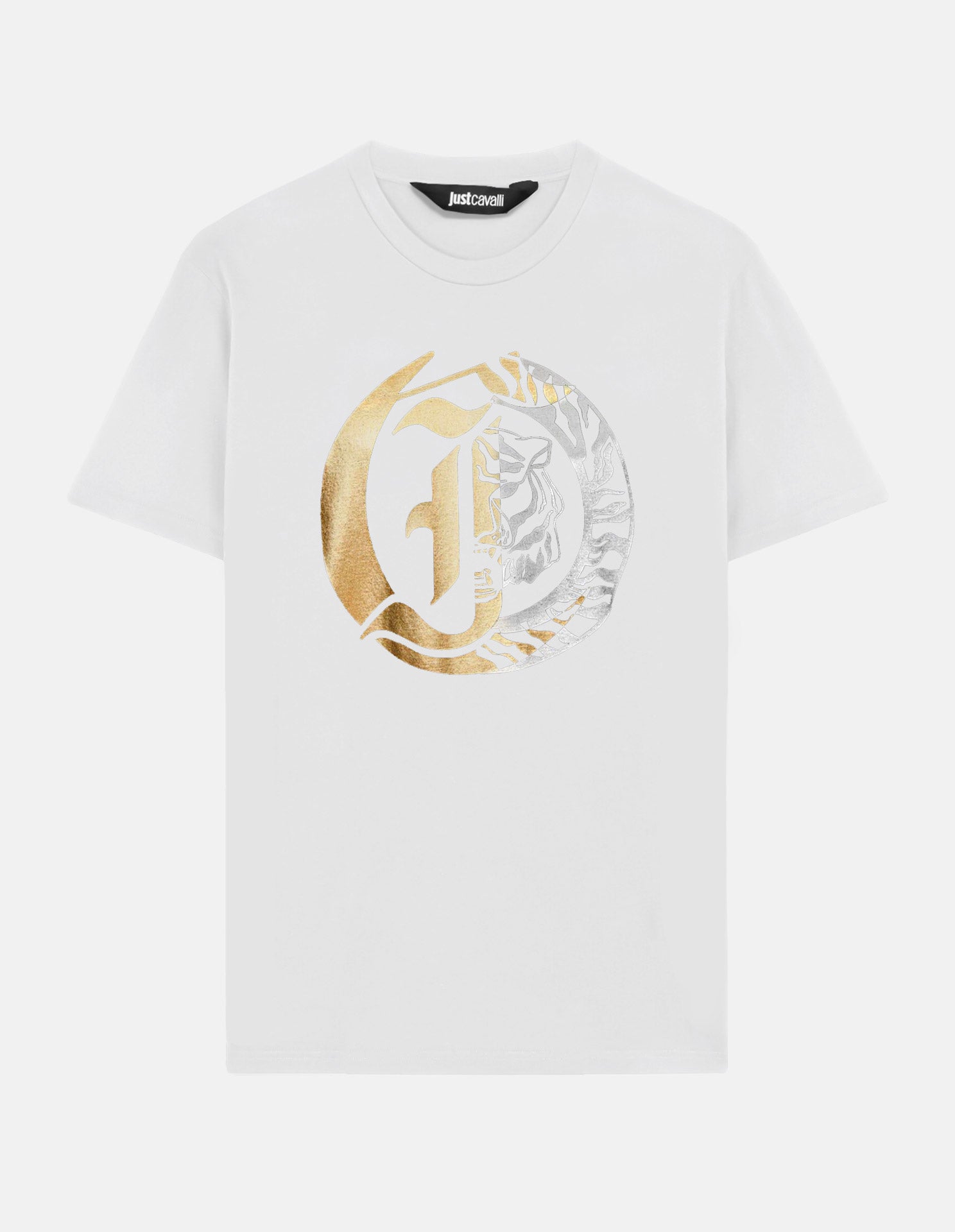 Mixing the Just Cavalli gothic logo with the distinctive Tiger emblem to create a fresh take on the design, this white regular fit t-shirt and the mix metallic print perfect to stand out and shine in the summer