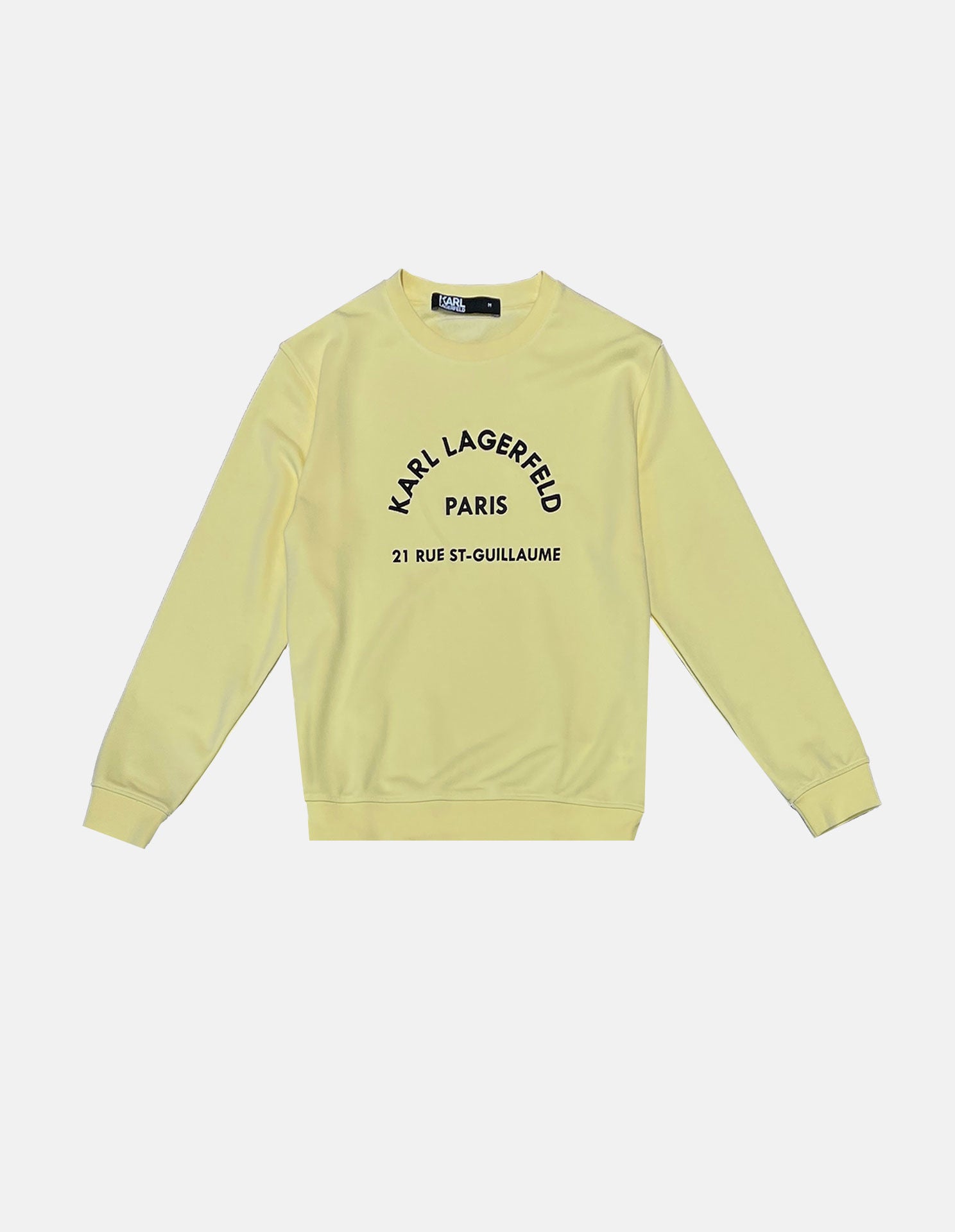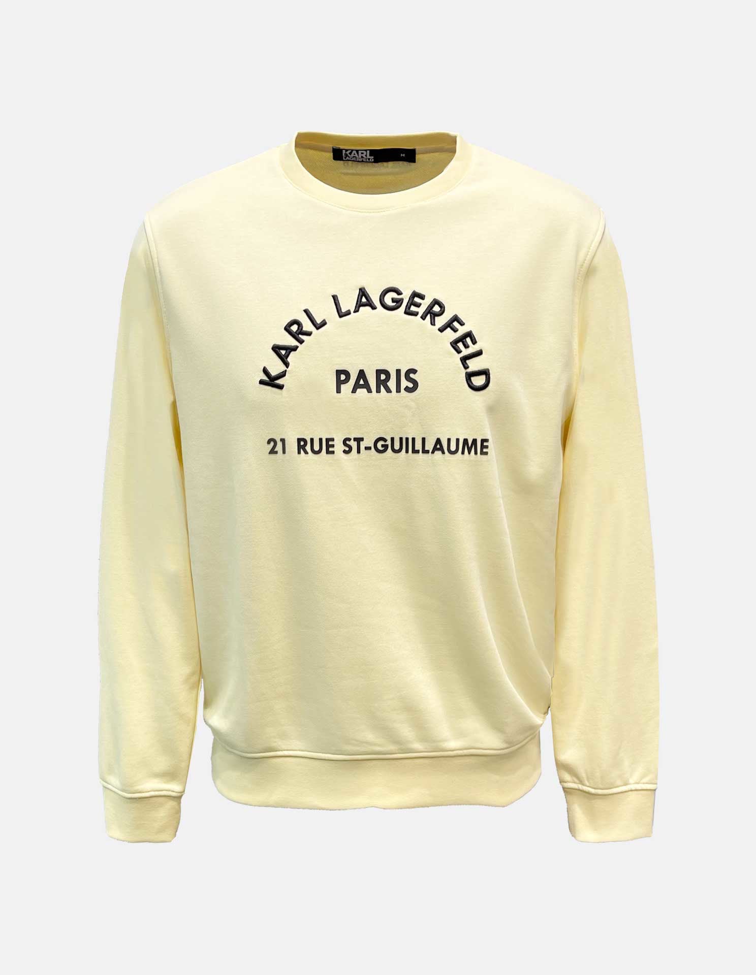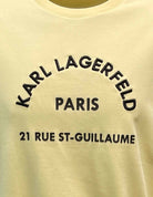 This Karl Lagerfeld sweat in Yellow with the Paris 21 Rue St Guillaume text embroidered is a definite style statement. Crafted from Cotton, it features a minimalist approach along with reflective lettering highlighting "21 Rue St Guillaume". This sweatshirt features a round neckline paired with a ribbed hem and cuff.