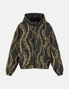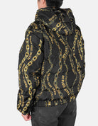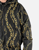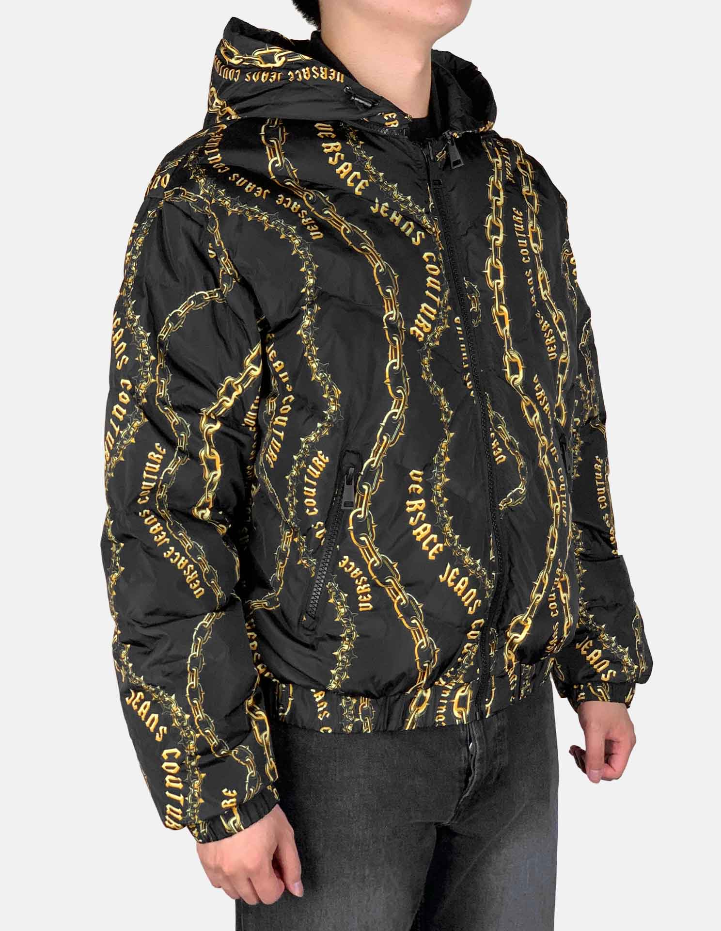 Stay warm with this reversible quilted down-filled jacket. One side showcases a bold gold-chain pattern, while the reverse is sleek black polyester taffeta with Gothic Chain V Emblem. Equipped with a detachable hood, this jacket offers both comfort and style